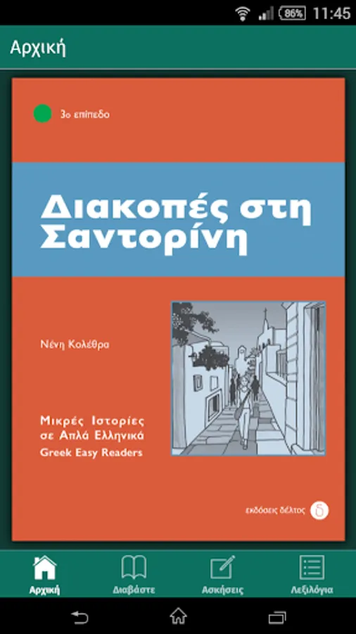 Τhe Greek Easy Reader Apps are language learning apps based on short stories accompanied by related exercises, which aim at improving the learner’s reading comprehension skills and building up their vocabulary. All stories are authored by experienced Greek language teachers. The narratives are original detective stories or adventure tales, which may be read and further exploited by the learner with or without the help of a teacher or dictionary. The series consists of 10 titles in 5 learning stages.