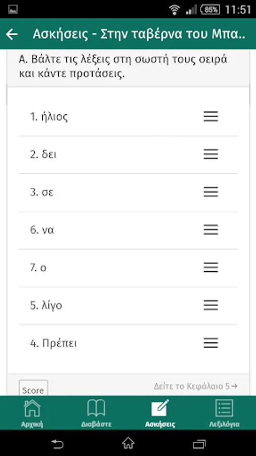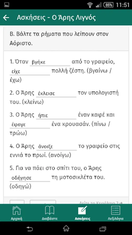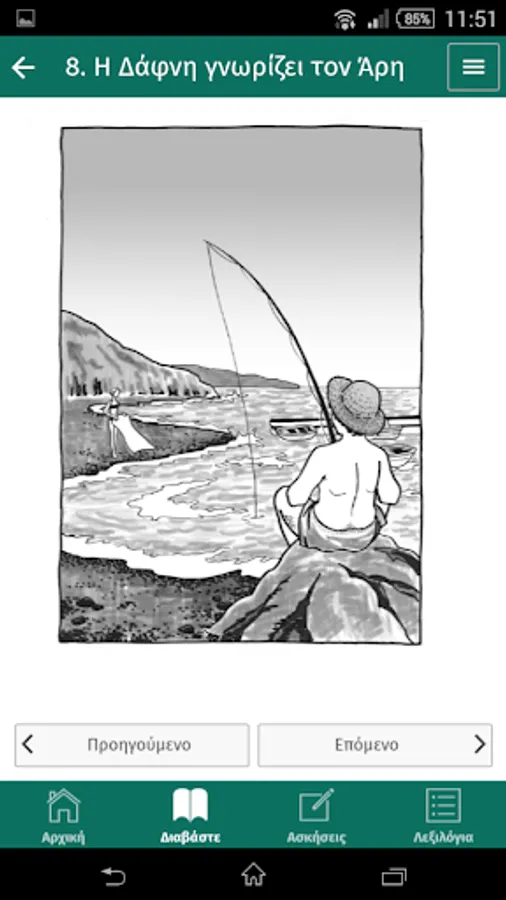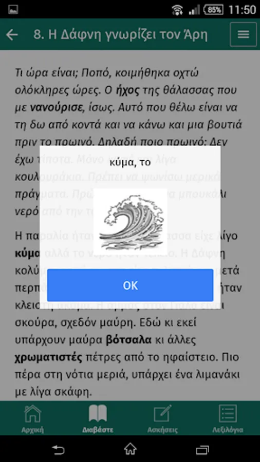You will see the titles of the chapters so that you can get an idea of the story. As you read through, you will find words or phrases in bold letters. By clicking on each word or phrase its meaning in simple Greek or a sketch will pop up (open) in a new window. The translation of the same items can also be found in the Λεξιλόγια (Vocabularies) section.