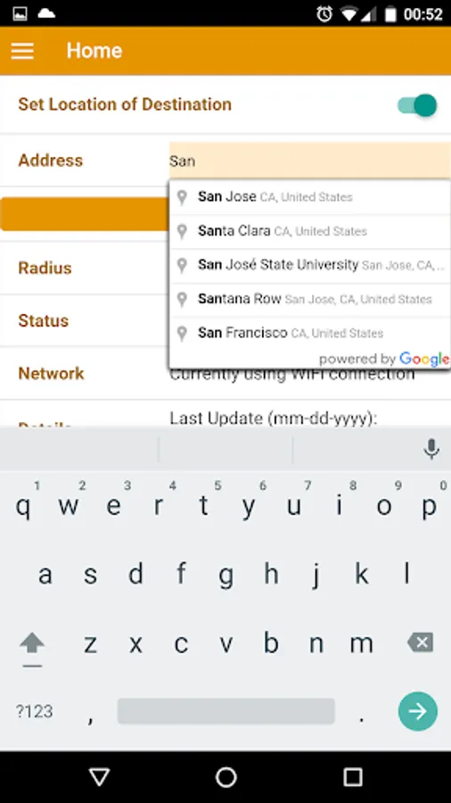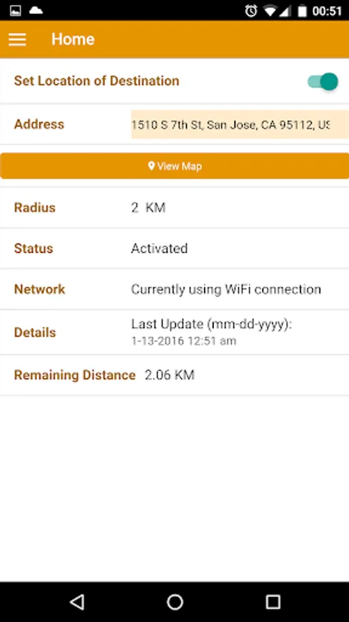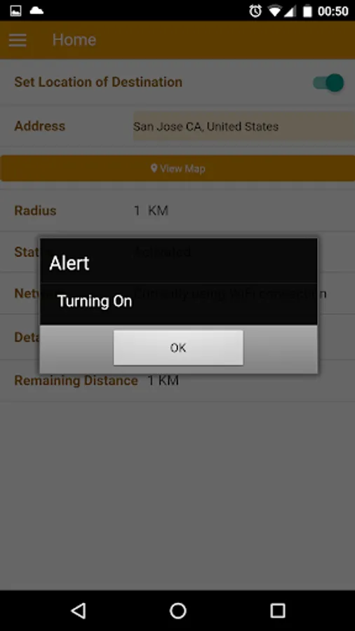 Once you set the destination location and radius of the fence you just have to click on the toggle button on top right corner to turn on the tracker. Upon turning on, the application will calculate the remaining distance to your destination, device's network connection status.