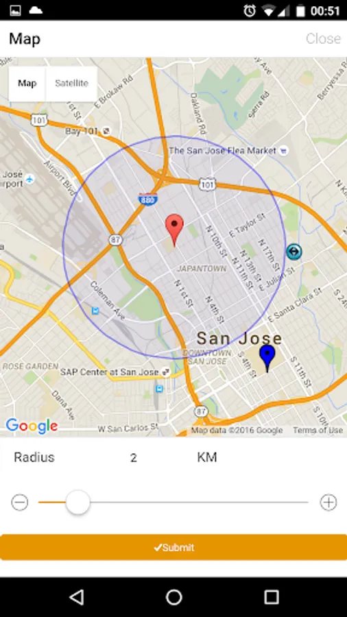 As soon as you open application, on Home page you have to set the destination location on which you need a alert upon reaching it. This destination location can be set either by entering address on Address input box or by clicking View Map button. Now, you can select location by pin pointing on the map, where you can see your current location pointed by blue marker. Here you can set the Geo-fence radius either by dragging the arrow on map, by entering radius value on radius input box or by dragging the pointer at the bottom. If you want to save the changes made, you have to press submit, and if you want to discard the changes, you have to click on close button.