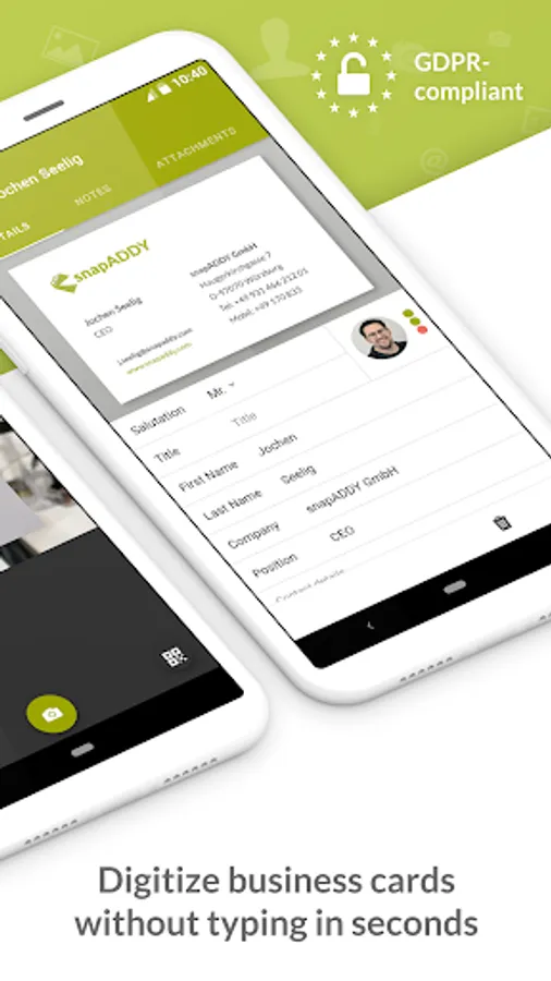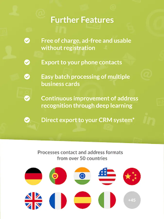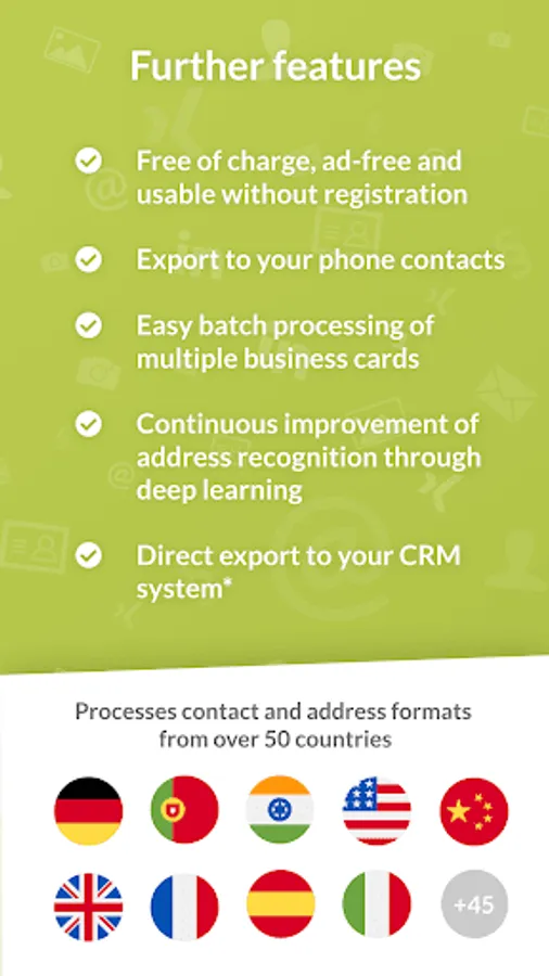 The snapADDY CardScanner is your productive assistant for mobile capturing of business cards. All you have to do is to take a picture of the business card with the app, the contact data will be recognized, automatically digitalized and formatted as a contact by our algorithm based on artificial intelligence. For contact and address formats from over 50 countries, the recognition has been perfected to reduce the error rate to a minimum. These include all G20 countries, the most important industrial and emerging countries.