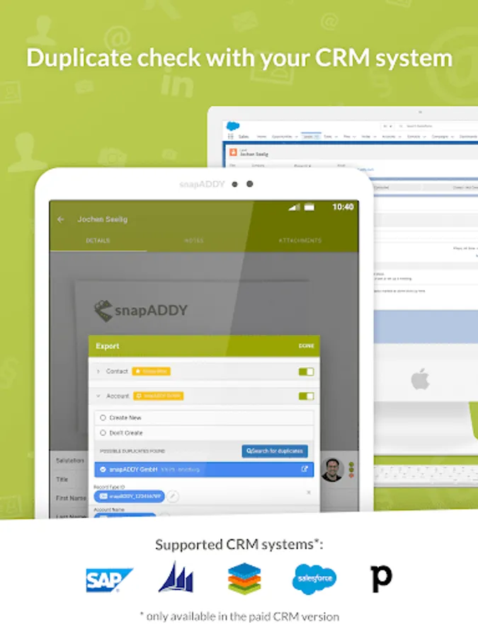 Through our website snapaddy.com, you can get the CRM version of snapADDY CardScanner for only $5 per month with the following additional features: