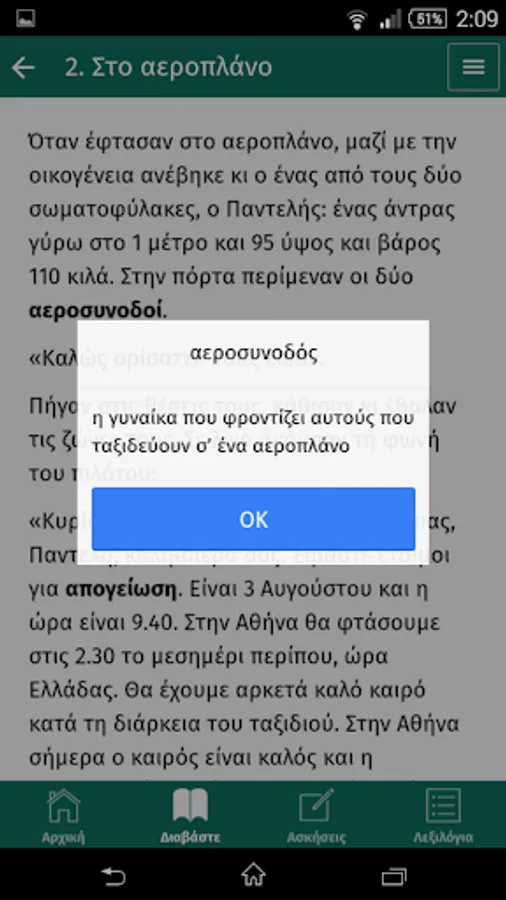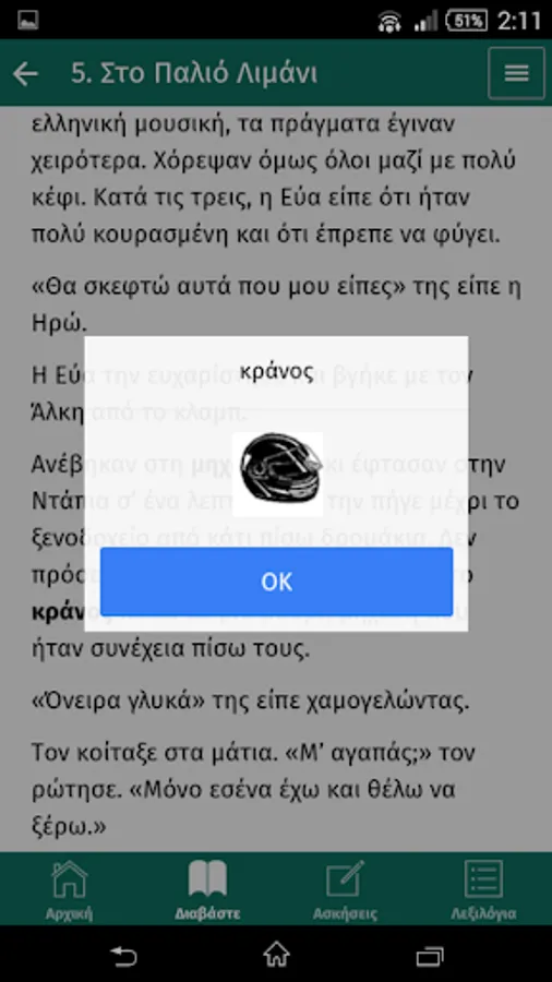 You will see the titles of the chapters so that you can get an idea of the story. As you read through, you will find words or phrases in bold letters. By clicking on each word or phrase its meaning in simple Greek or a sketch will pop up (open) in a new window. The translation of the same items can also be found in the Λεξιλόγια (Vocabularies) section.