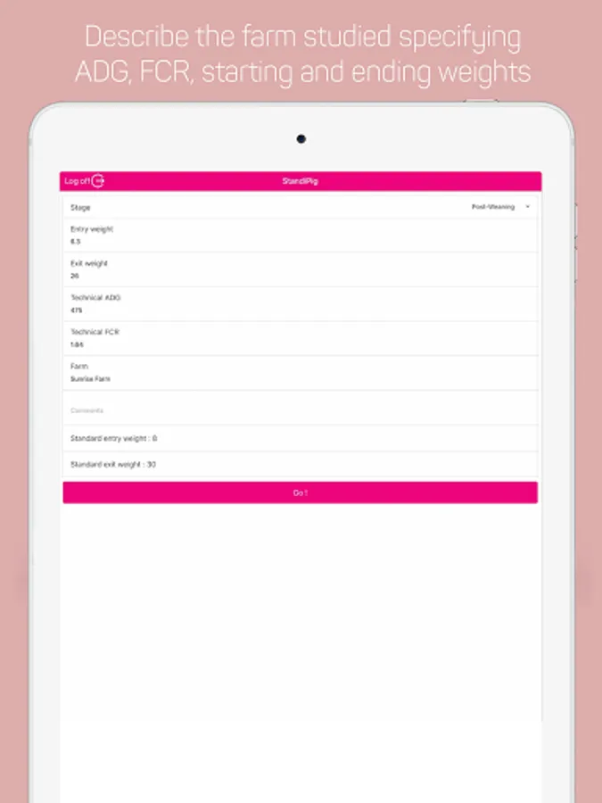 At first must be chosen reference weight for the periods studied (either post-weaning, fattening or weaning to finish). Then, case by case the following data are used for the observed zootechnical performances: ADG, FCR, starting and ending weights. The results are the standardized ADG and FCR for the reference period chosen