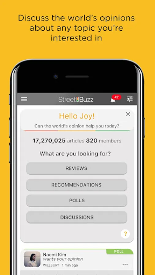 StreetBuzz is the world's first mobile platform for public opinions. Think of it as a next-generation "Phone-A-Friend" lifeline, with the whole world waiting on the other side of your phone to help you with whatever you need. If you believe that the opinions, reviews, and recommendations of people across the world can help you make smarter decisions and broaden your perspectives, get StreetBuzz now.