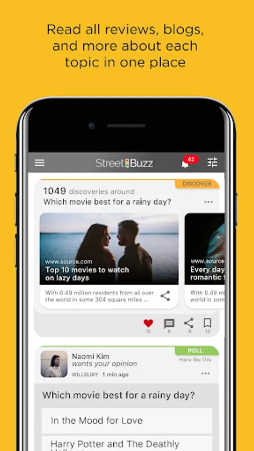 Also, once you get StreetBuzz, you won't need to clutter your phone with other review apps - one for Travel, another for Restaurants, yet another for Films. Neither will you need to manually research reviews, blogs, or forums one by one, ever again. For every topic you care about, StreetBuzz will now pull together the best online user and expert opinions and serve them all in one place for you to discover at your convenience.