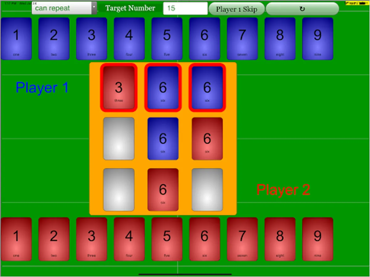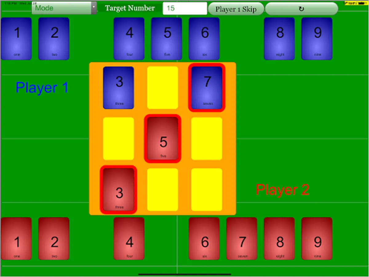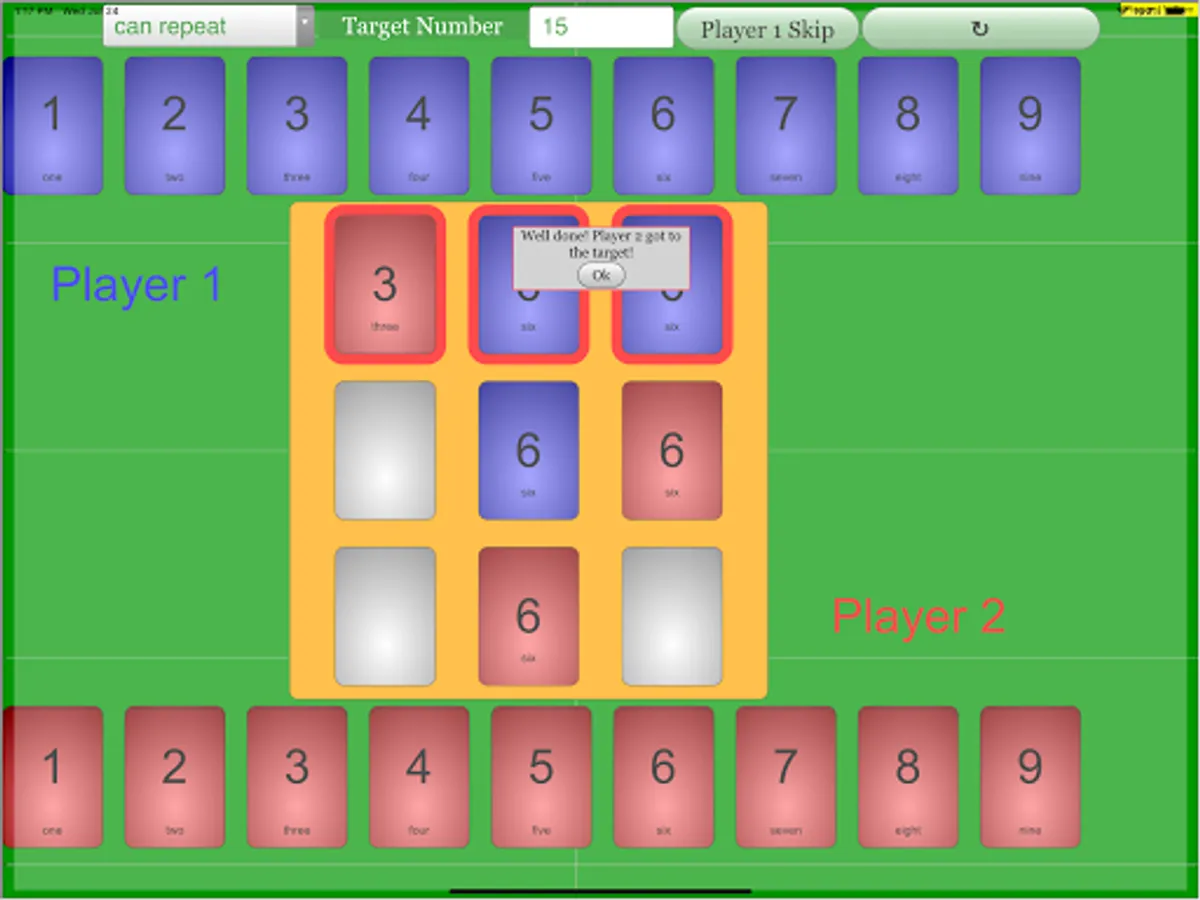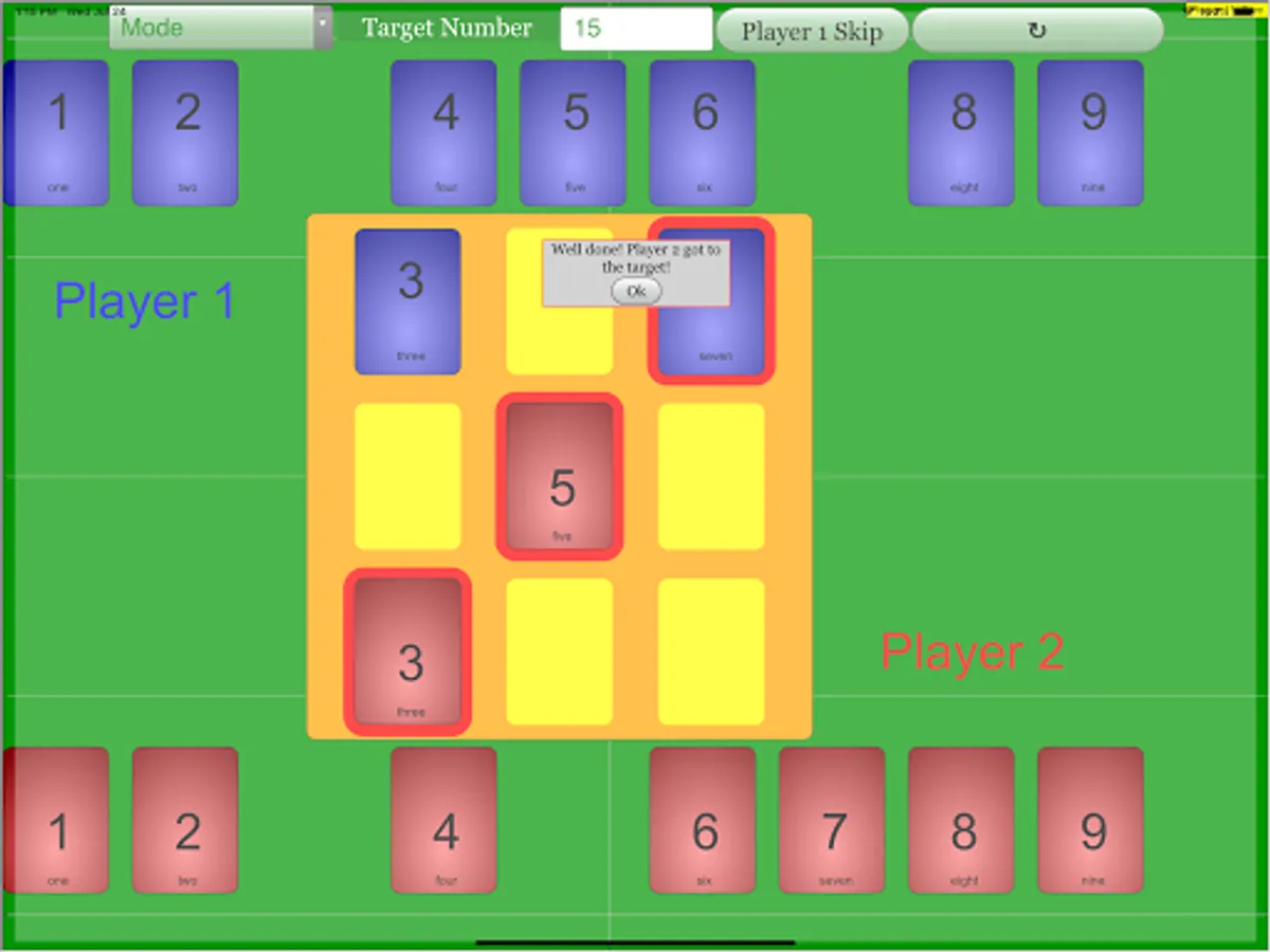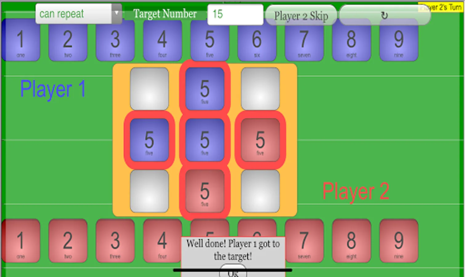 (Player 1 reaching target number 15)