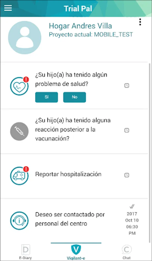TrialPal is a mobile application that brings together the functionalities of other mobile applications developed by integra IT in one, which are: E-Diary, Vigilant-e and Vax-Chat. Depending on the client's need, the application must have the ability to adapt to the modules that the client has contracted.