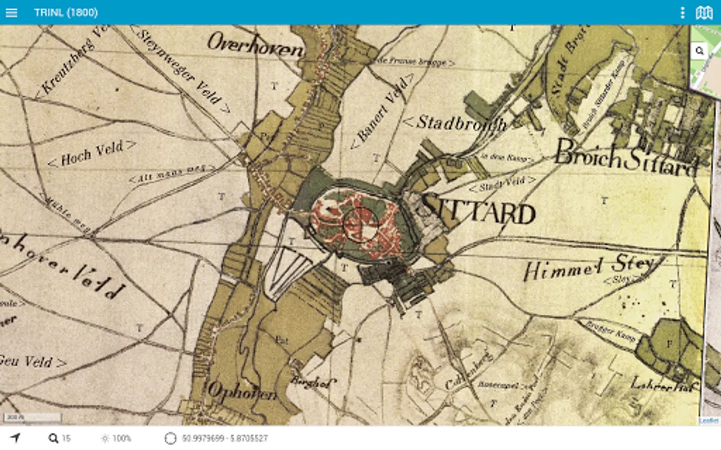 The most special maps in the app are the Tranchotkaarten (1800). These are seen as the first real topographic maps of Limburg. For the first time the digital maps are suitable for use with GPS.