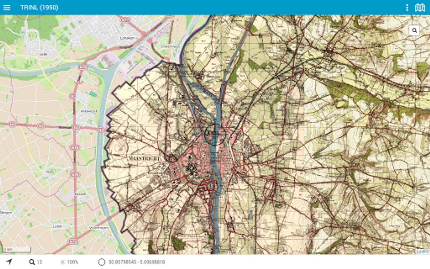Time travel in Limburg was never so easy as with this app. Want to see a street or 200 years ago was already? How the meandering of the river Meuse was a hundred years ago? Was there in 1800 all buildings on the place where you live now? What nature has disappeared since 1900? The app provides insight into the most important spatial developments in the province of Limburg.