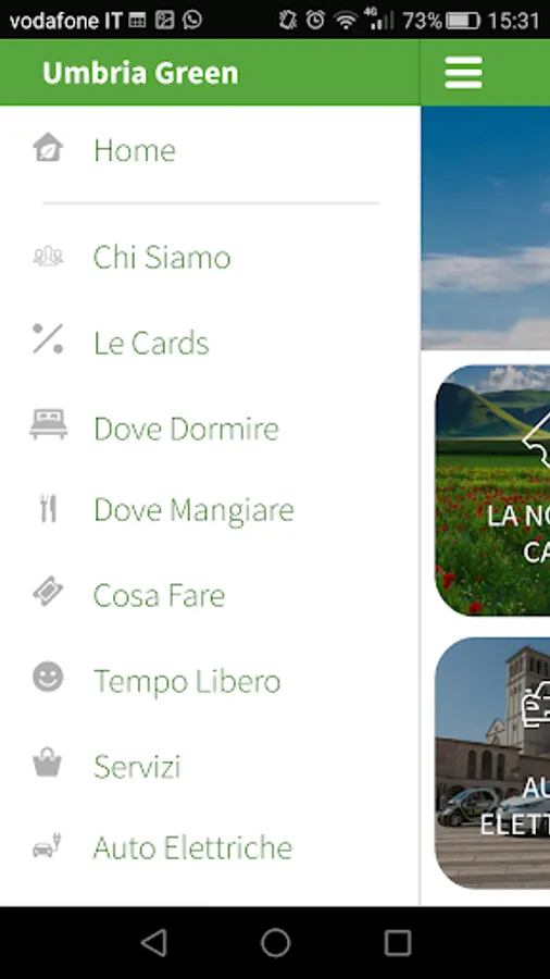 Through the application you can buy our Umbria Green Cards, find discounts at the facilities (restaurants, cottages, hotels, cellars, etc ...), utilities (shops, craft workshops, spas, etc ...) the cultural attractions (exhibitions, museums, events etc) closer to you, you can book the use of an electric car to travel the routes proposed by Green Incoming Umbria, and locate charging stations for electric vehicles.