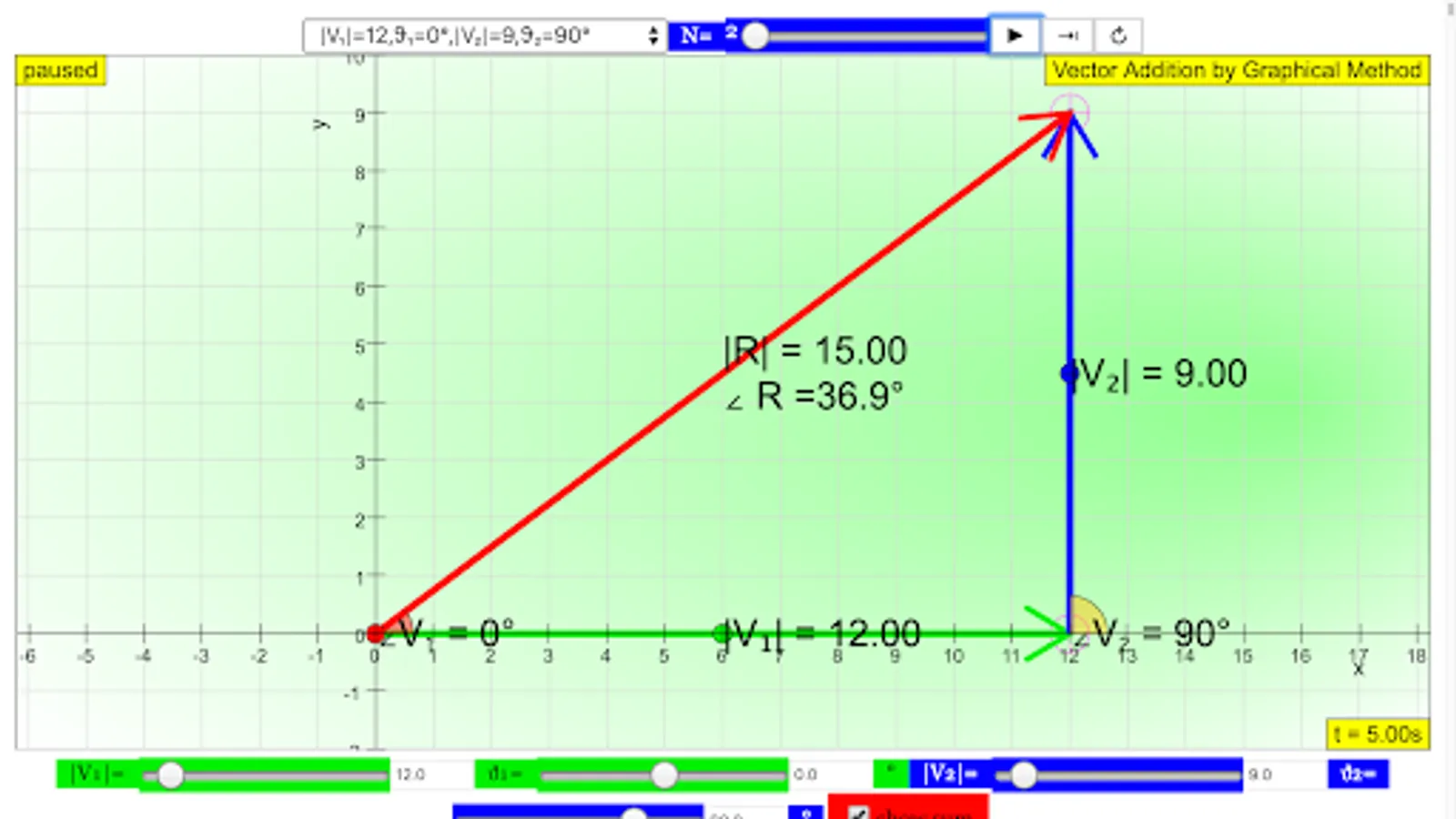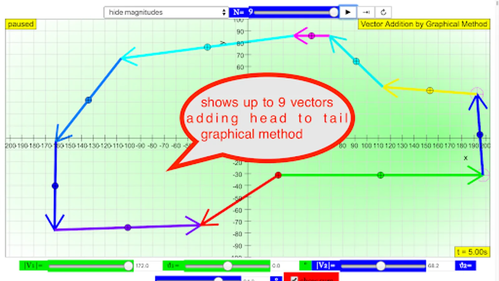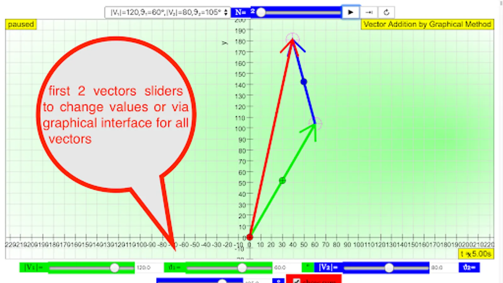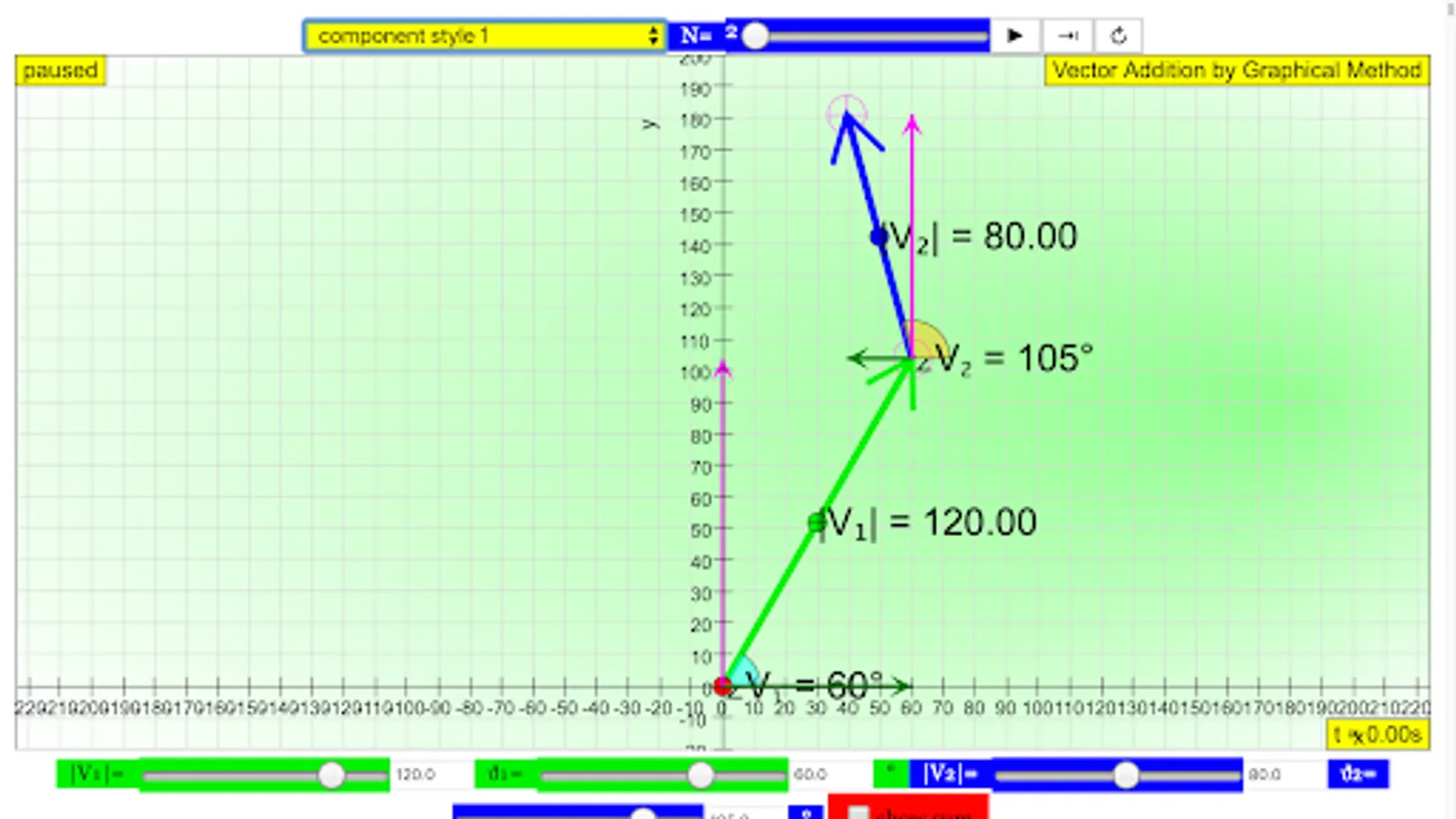 Play with the vector sum Model. The simulation randomly generates different vector A and B every time the reset is clicked. You can drag the vector midpoint to re-position drag the vector head to re-size There are also 3 examples of how this simulation can be used by Teacher Mr. Ezzy Chan. There is also 3 components representation to connect with the related simulation on components of a vector. Dragon the plotting panel to reposition the center to have a better view of the resultant vector.