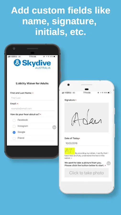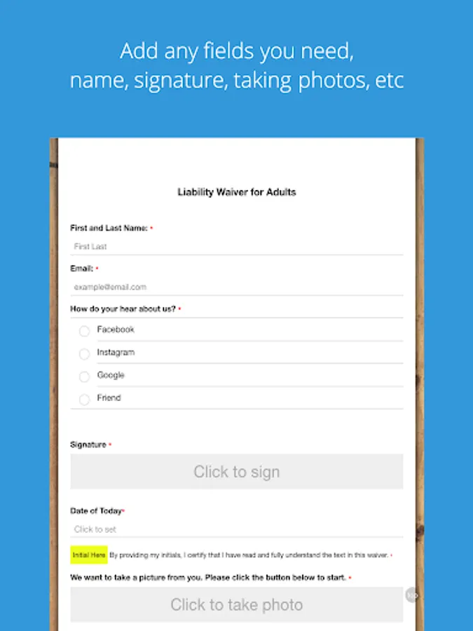- Collect information from you customers. You can add names, emails, phone numbers, signatures, or initials, etc. on your digital waiver. You can add any fields you need to the digital waiver template. We will store your customer information securely on our cloud based database.