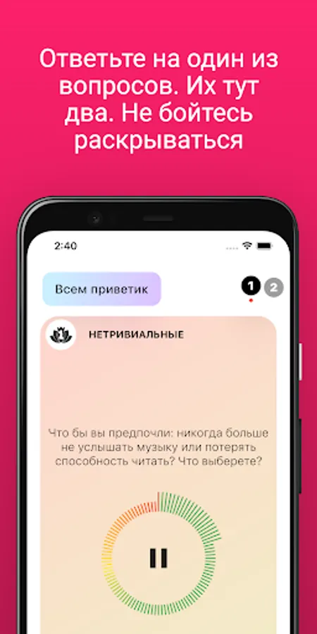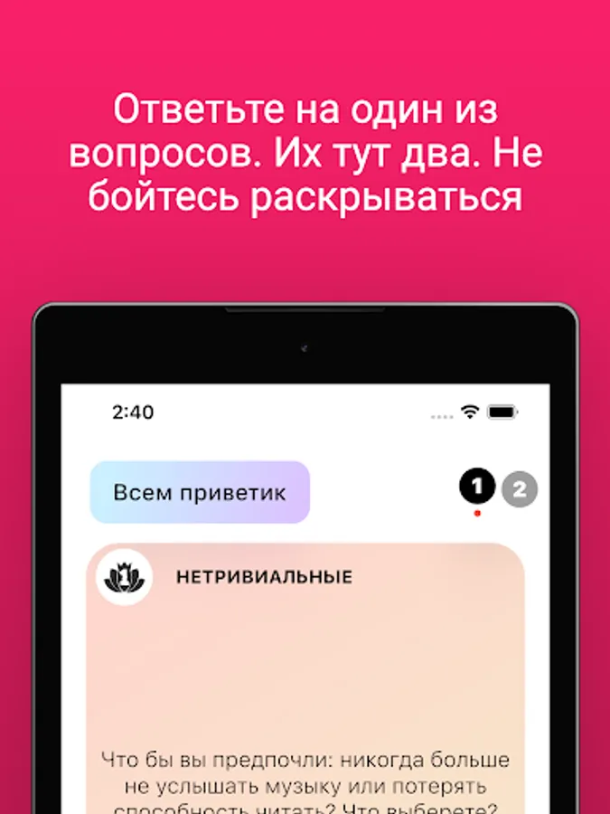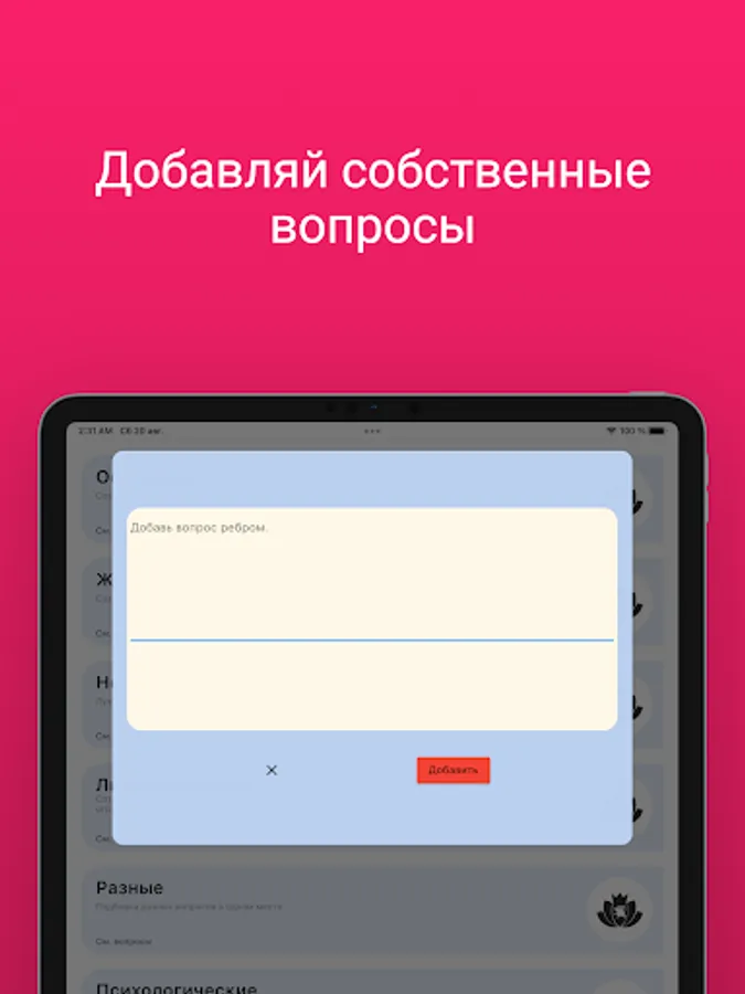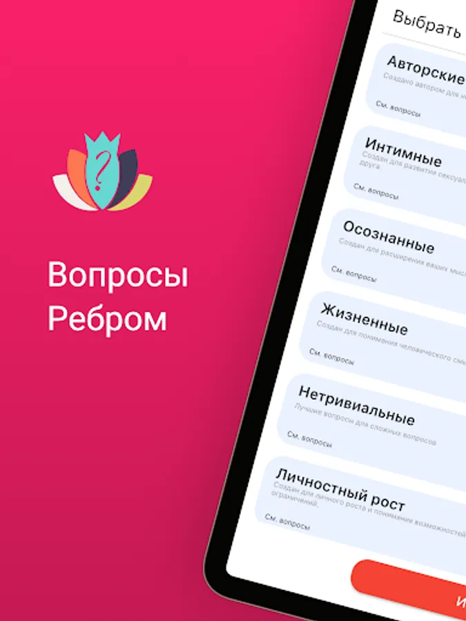 Questions Edge - the name speaks for itself. There are topics for various conversations. If you get bored in the company of friends, you can always use our application. Questions will help you get to know your friends and acquaintances from a new perspective.