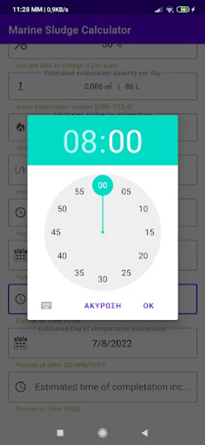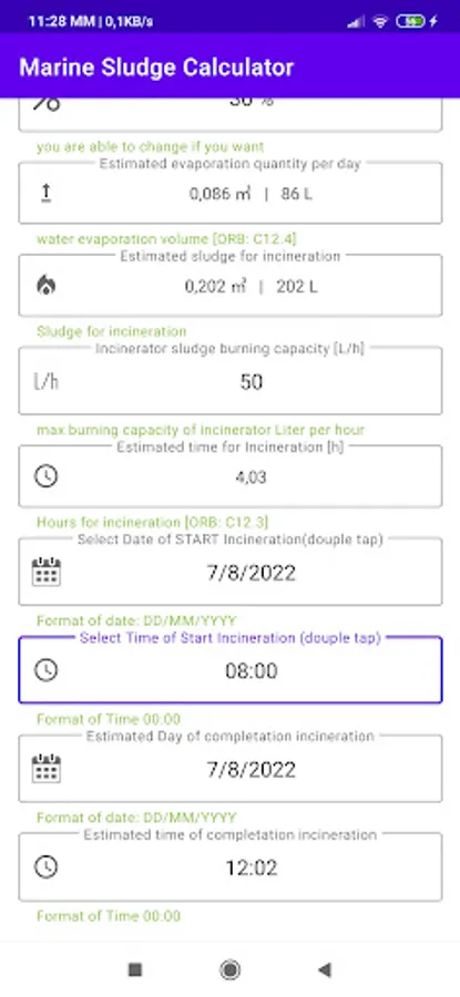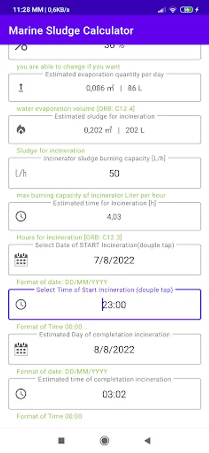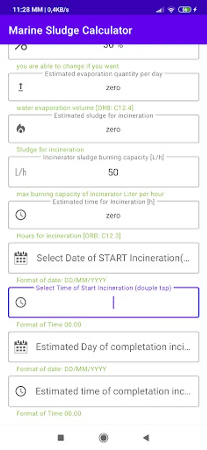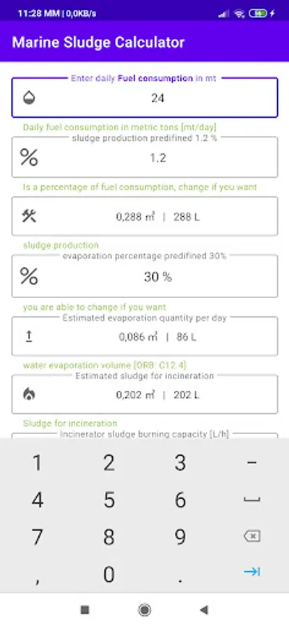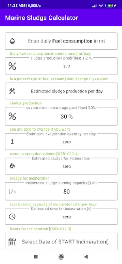 The "Marine sludge Calculator" has been created from a mariner to mariners and shipping maritime offices. The application is very useful for marine engineers and Technical departments. The user must provide the daily fuel consumption, and is able to change the sludge percentages and evaporation percentage. The user must write also the maximum sludge burning consumption of incinerator.