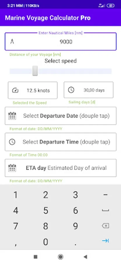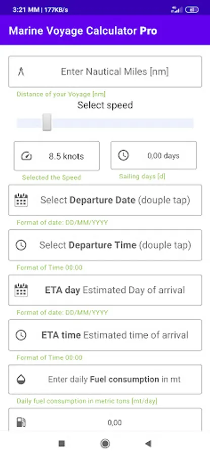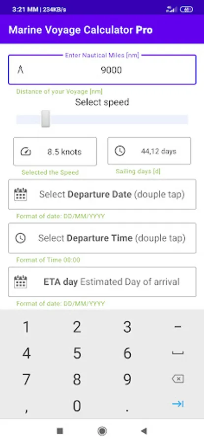 The "Marine Voyage Calculator" has been created from a mariner to mariners and shipping maritime offices. Is very useful for deck officers and masters but also useful for chief engineers. The user must provide the voyage distance in nautical miles. The user also can select the ship's speed by his own with a seek bar the output is the sailing days.
