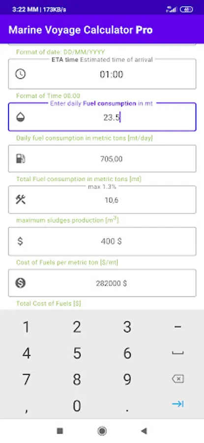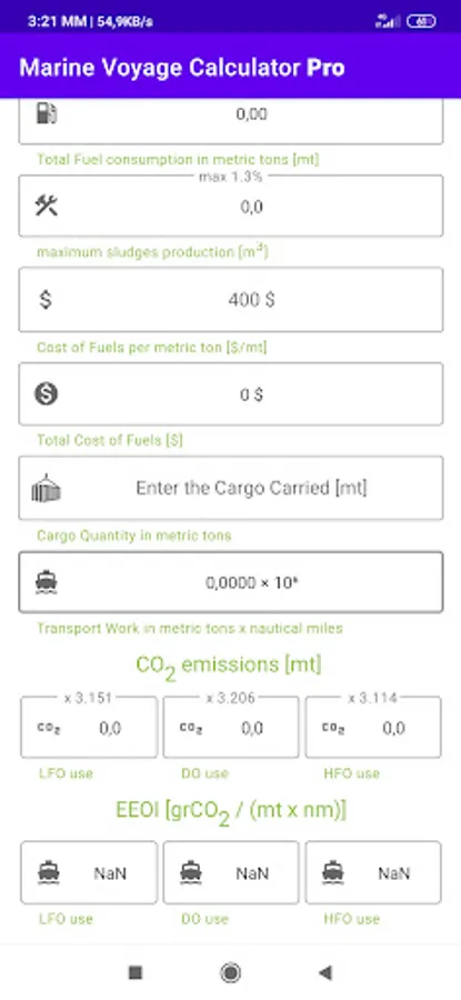 By known speed appears to user the total fuel consumption of this voyage the CO2 emissions(DO use, or LFO use or HFO use), the maximum sludge production and the total fuel cost. The user can entry the daily consumption of the ship (has been predefined 24mt/day) but he can change with his own consumption. The user can provide the fuel cost per metric ton in dollars (has been predefined 400$/ton).
