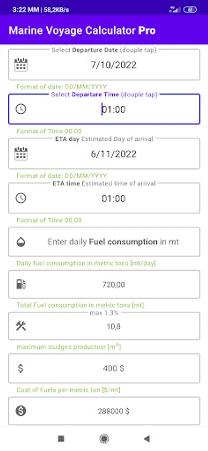 The user is able to select Departure Date and time. By the average speed the application provides the ETA date and time (Local or GMT time depends on the user entry). Be careful the app doesn’t remove the hours retard on advance will be happened.