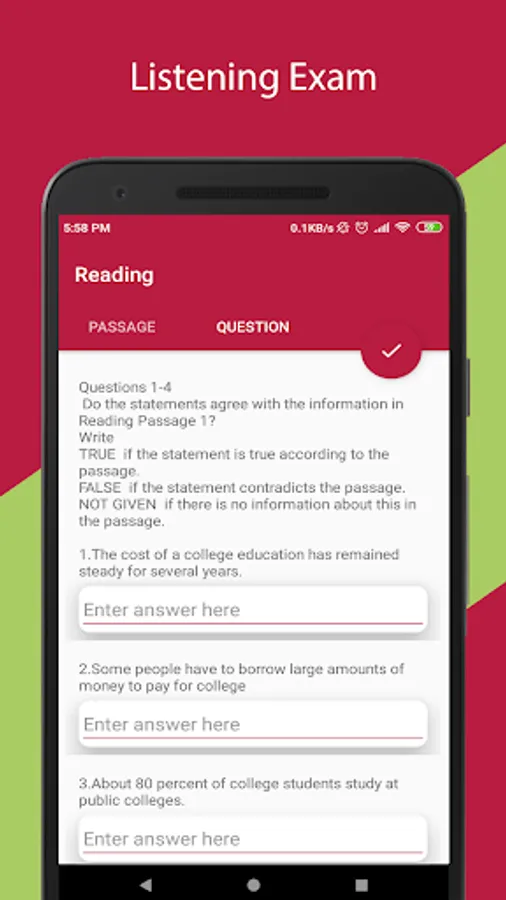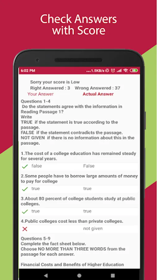 This application helps you learn the crucial ideas tested on the IELTS Reading with elaborated follow queries. As you follow queries on IELTS Reading, the app tracks your performance and check strengths and weaknesses by showing your score.