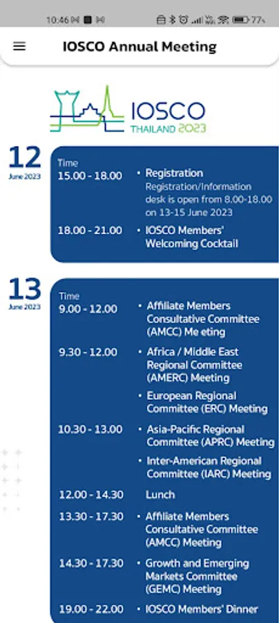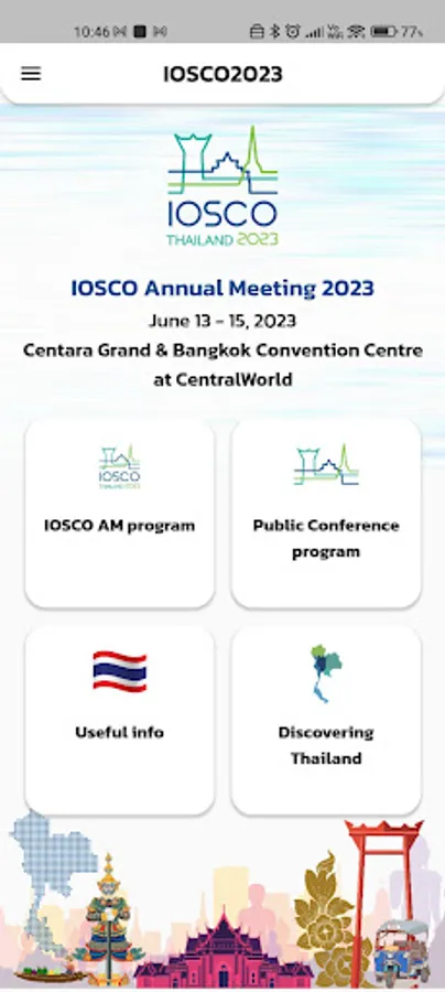 IOSCO 2023 Thailand is the official application for the 48th IOSCO annual meeting which will be held during 13-15 June 2023 and followed by the SEC Thailand Public Conference on 16 June 2023 at Centara Grand & Bangkok Convention Centre at CentralWorld, Bangkok, Thailand.