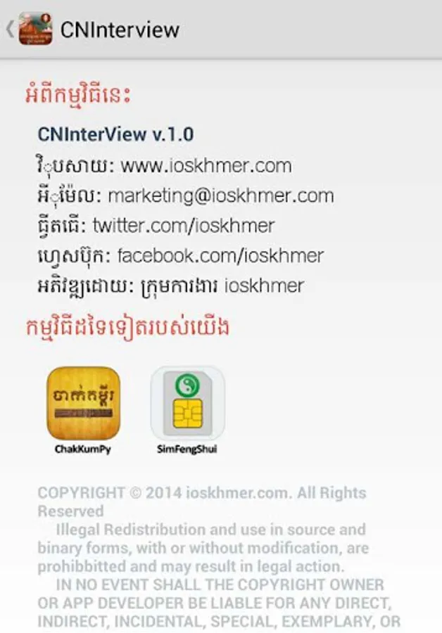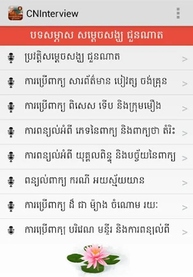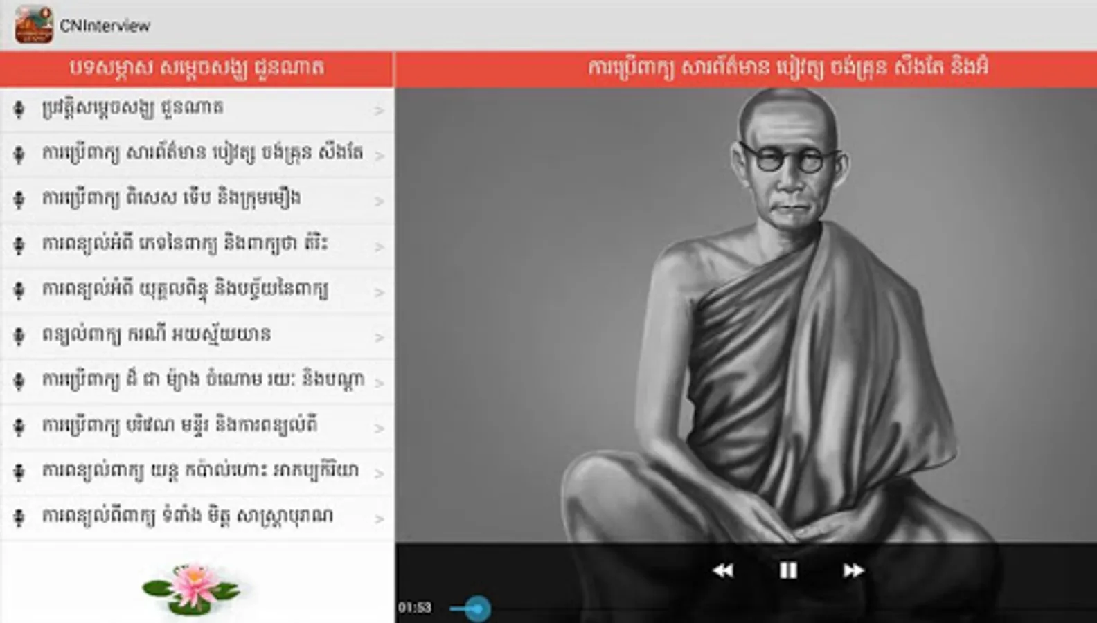 CNInterview or Chuon Nath's Interview is an app that you can listen to a collection of Samdech Sangha Raj Jhotañano Chuon Nath's various audio interviews. Samdech Chuon Nath is the most respectful supreme monk in Cambodia, the first truly Khmer literature Ph.D and a scholar who is well versed in many fields. This app is a must for all Khmers who are interested in Khmer literature and Buddhism.
