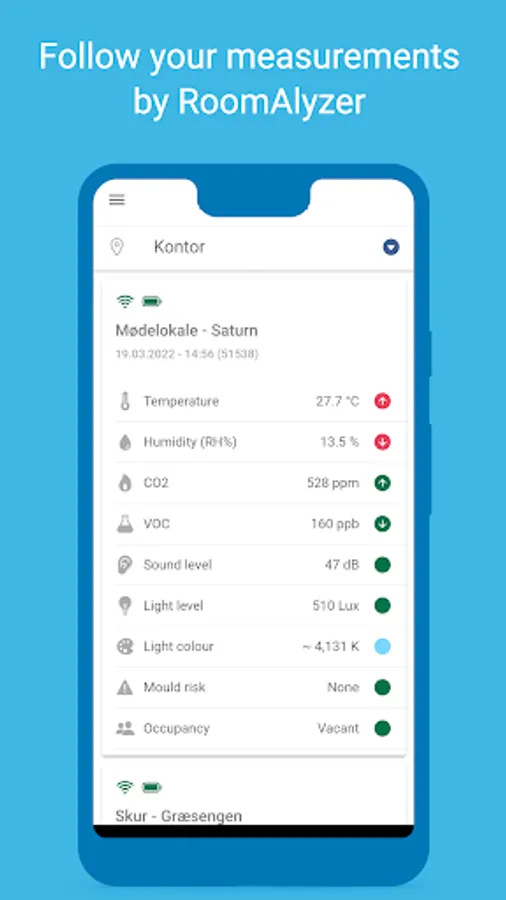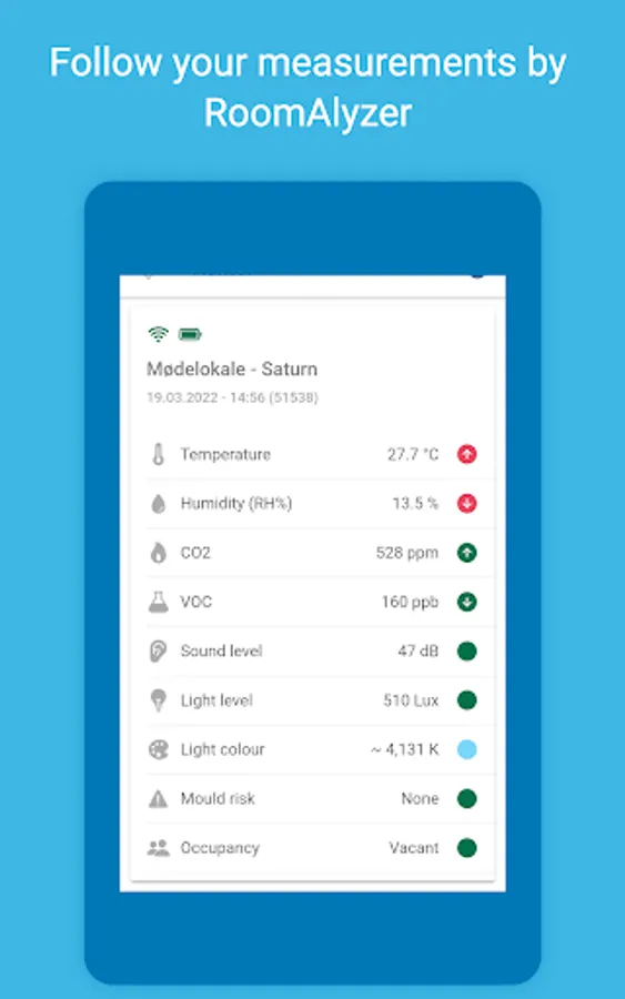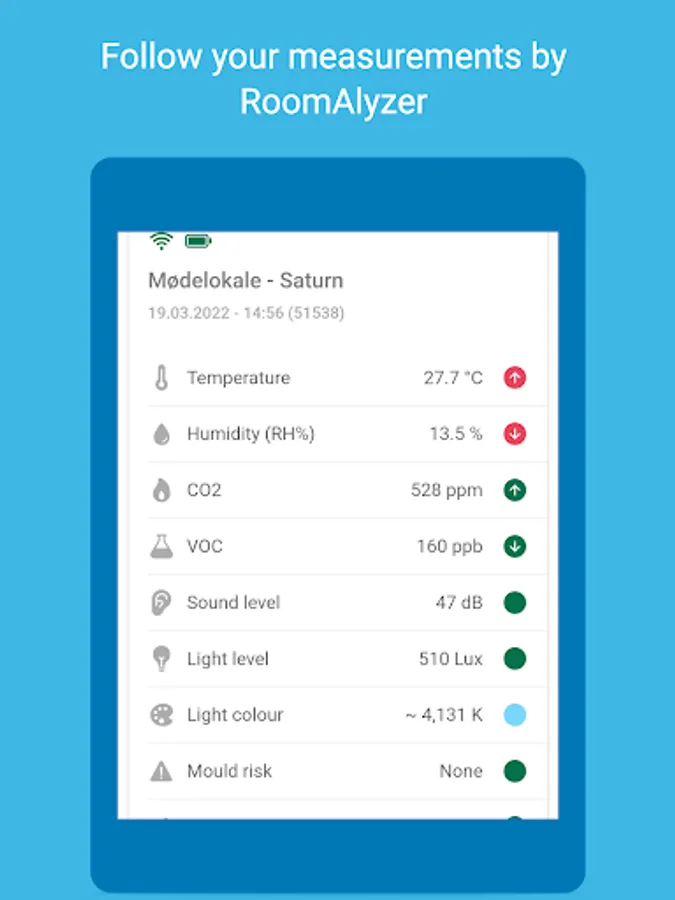RoomAlyzer measures temperature, humidity, CO2 (real), VoC, noise, light level, light colour and usage of rooms. Your data comes complete with analyses, statistics, warnings/notifications and a mould prognosis.