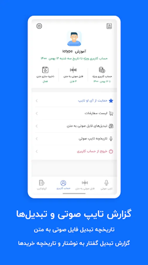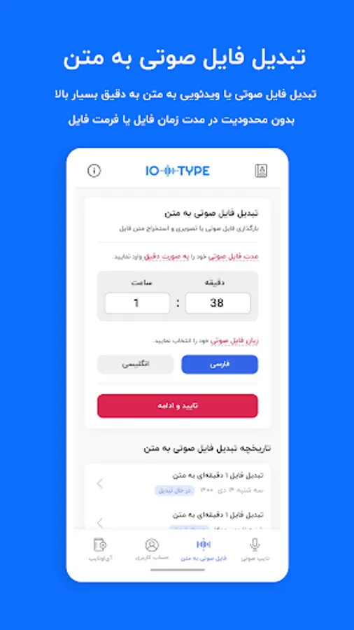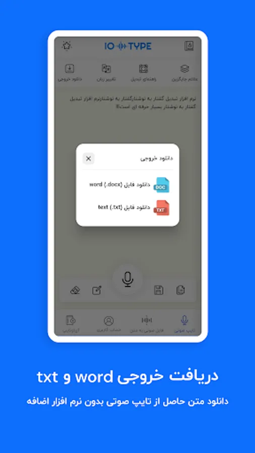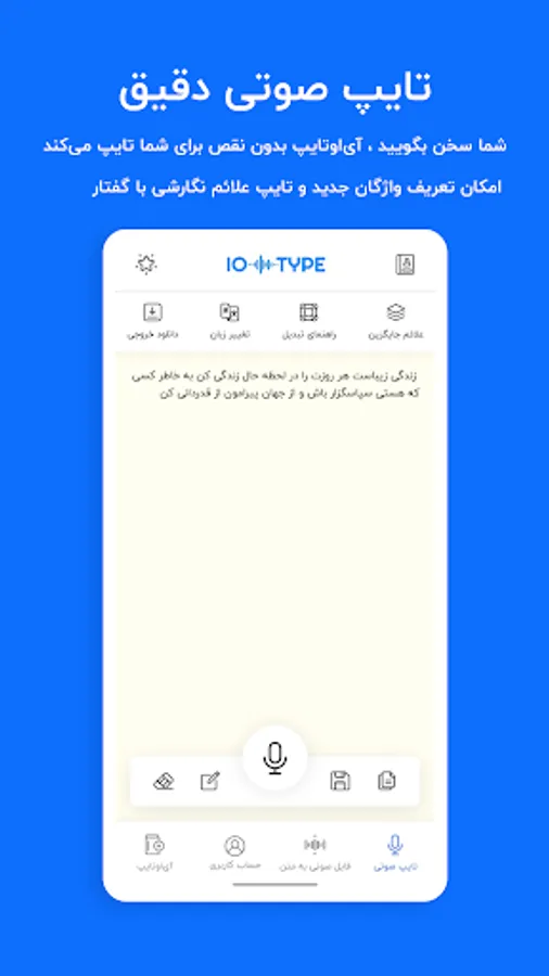 Iotype speech to text and voice to text conversion application is the most accurate software in Persian language, which is designed based on artificial intelligence and deep machine learning, and converts your voice into text with 99% high accuracy. Even the software can recognize your specialized and technical vocabulary. If you work in technical and engineering fields, law, medicine, article typing and in general in the field of typing, this software is one of the main needs in the Persian audio typing section.