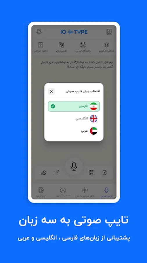 Currently, IoType voice typing software supports three languages: Persian, English and Arabic.