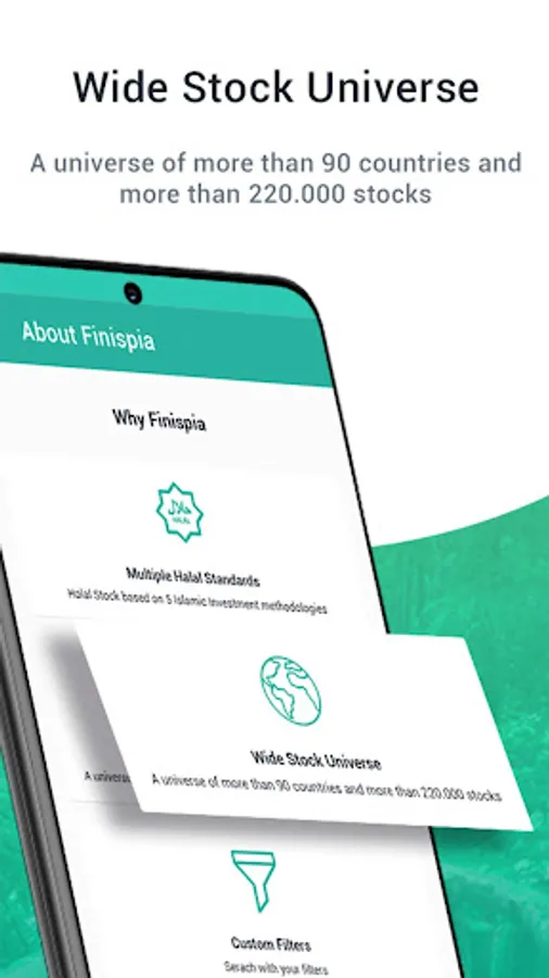 Finispia provides results based upon five mainstream Islamic investment methodologies including: DowJones, Standard & Poors, FTSE, MSCI and AAOIFI.