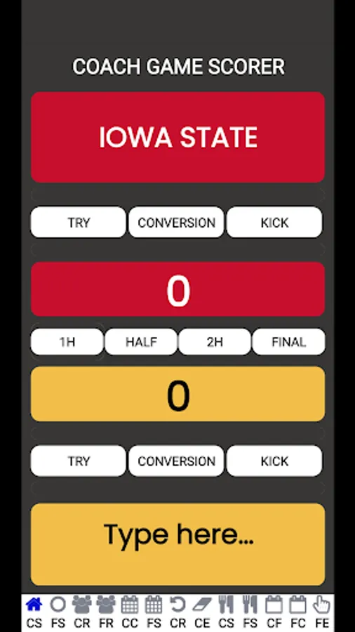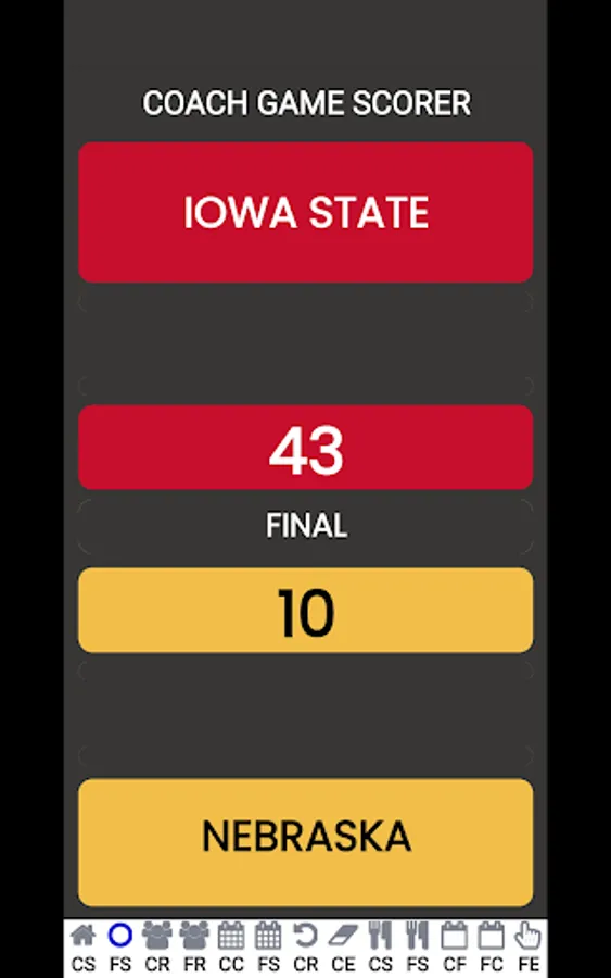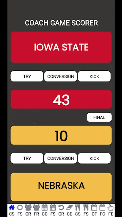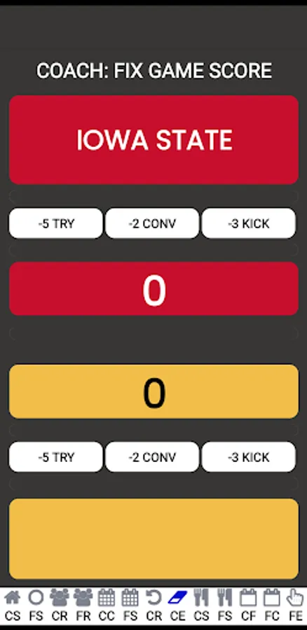 This app is the coach's version of the Iowa State Rugby App. The coach uses this app to keep score of the game which then pushes the data to the Iowa State Rugby Fan App.