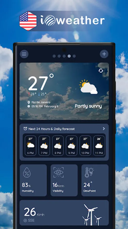 iOweather also provides accurate conditions, wind speed and wind direction, maximum temperature, minimum temperature, atmospheric pressure, humidity, precipitation in different units, dew point, probability of rain in 24 hours no matter where you are.