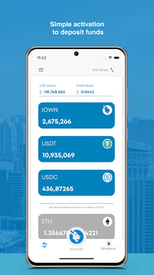 The iOWN Wallet currently supports Ethereum (ETH), iOWN Token (iOWN), Tether (USDT).