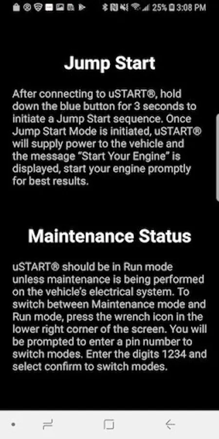 uStart® bluetooth remote control Application. Allows users to connect to uStart® units through bluetooth. Application shows important information such as voltage, current mode, and battery charge. This application will also allow the user to start a jump start with the uStart®