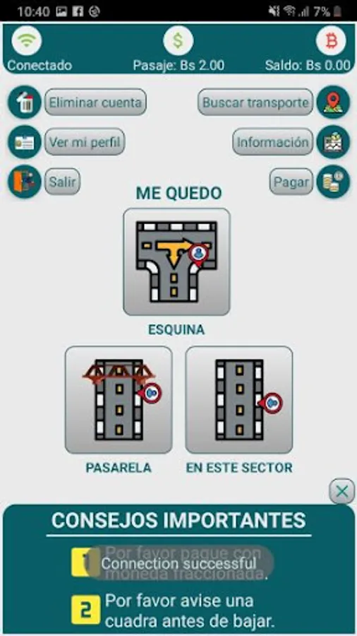 Esquina allows you to connect with a public transport vehicle where you can see fare cost, driver information, route information and pay the fare through the application.
