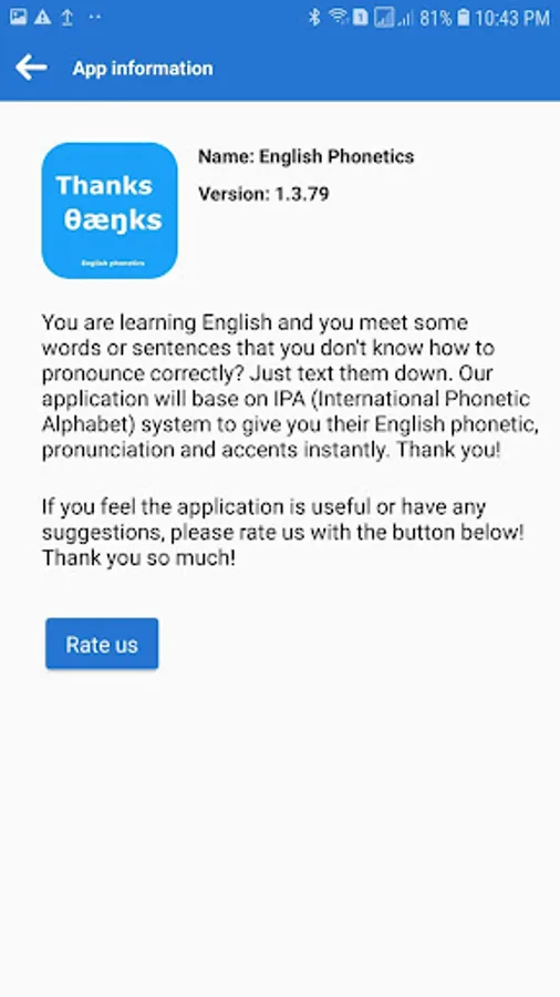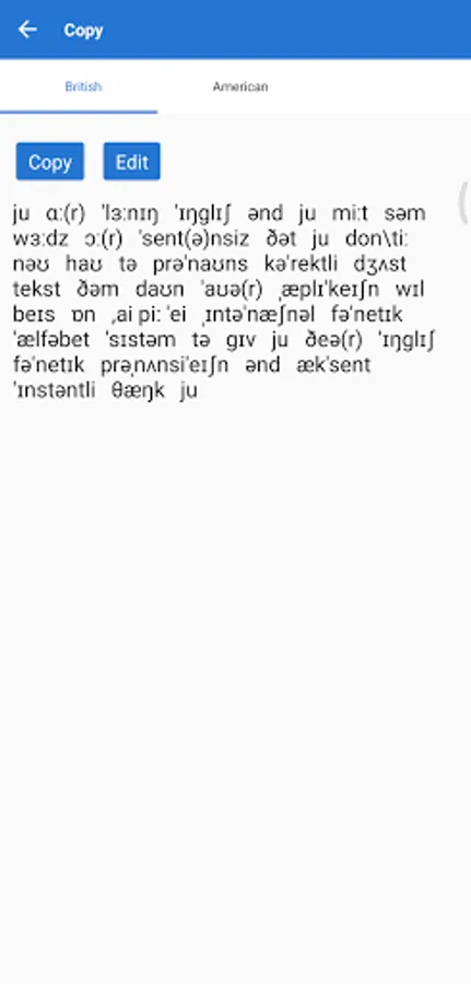 You are learning English and you meet some words or sentences that you don't know how to pronounce correctly? Just text them down. Our application will base on IPA (International Phonetic Alphabet) system to give you their English phonetic, pronunciation and accents instantly (Even when you are Offline). Thank you!
