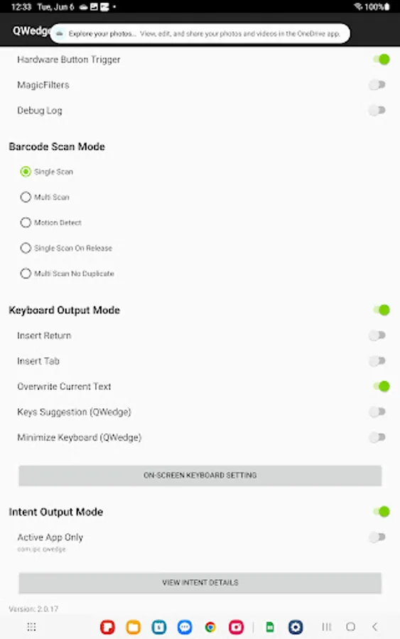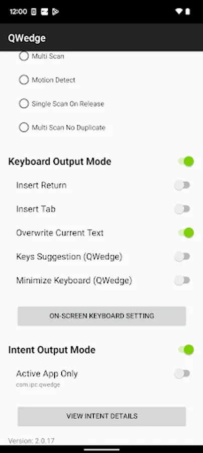 The intent API enables any app to send an intent with a command to QWedge, such as start/stop the scan engine or capture an image, then the result intent will be sent to the app via the defined Intent API.