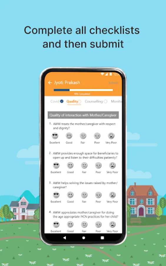 The App contains checklists to observe and rate quality of service provision for conducting field visits and supervising review meetings contextualised to each supervisory cadre. Checklists have multiple-choice questions to record appropriate answers.