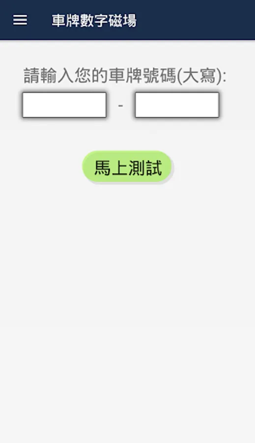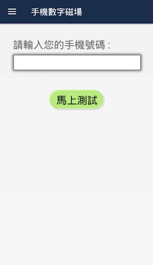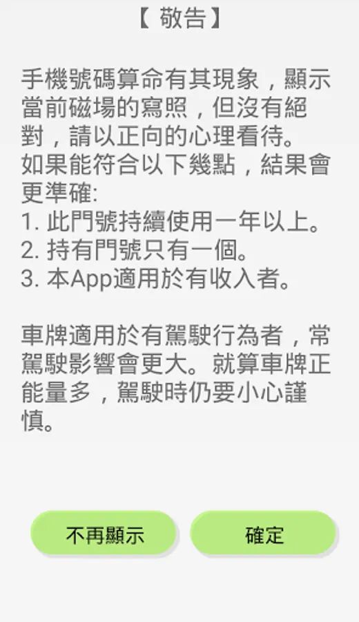 This application currently provides digital magnetic field analysis of mobile phone door numbers and license plates. The part of the mobile phone door number focuses on the analysis of wealth and business, so that you can know what kind of phenomenon you have in the business of wealth and business through your mobile phone number. The part of the license plate focuses on the phenomenon that may occur when driving this car (automobile, locomotive, etc.). This application does not receive, collect or apply any numbers you enter. Please use it with confidence.