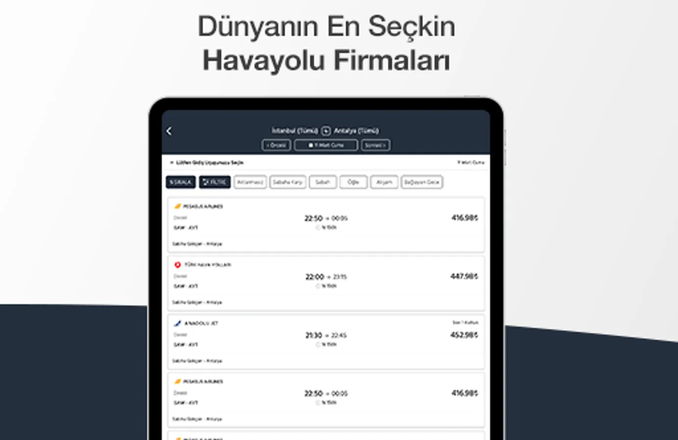 With Biletall, you can purchase Anadolu Jet, Pegasus, Turkish Airlines (THY), SunExpress, Atlas Global, Onur Air flights for your domestic flights, tickets of all airline companies such as Ukrainian Airlines, Luftansa, KLM, Emirates, Delta for your international flights, as well as You can find tickets of all local airlines that offer cheap airfare prices as well.