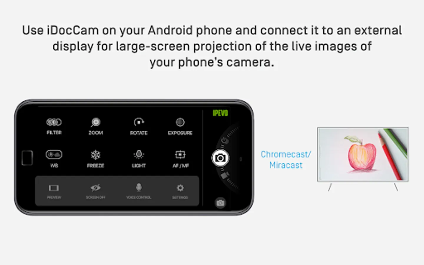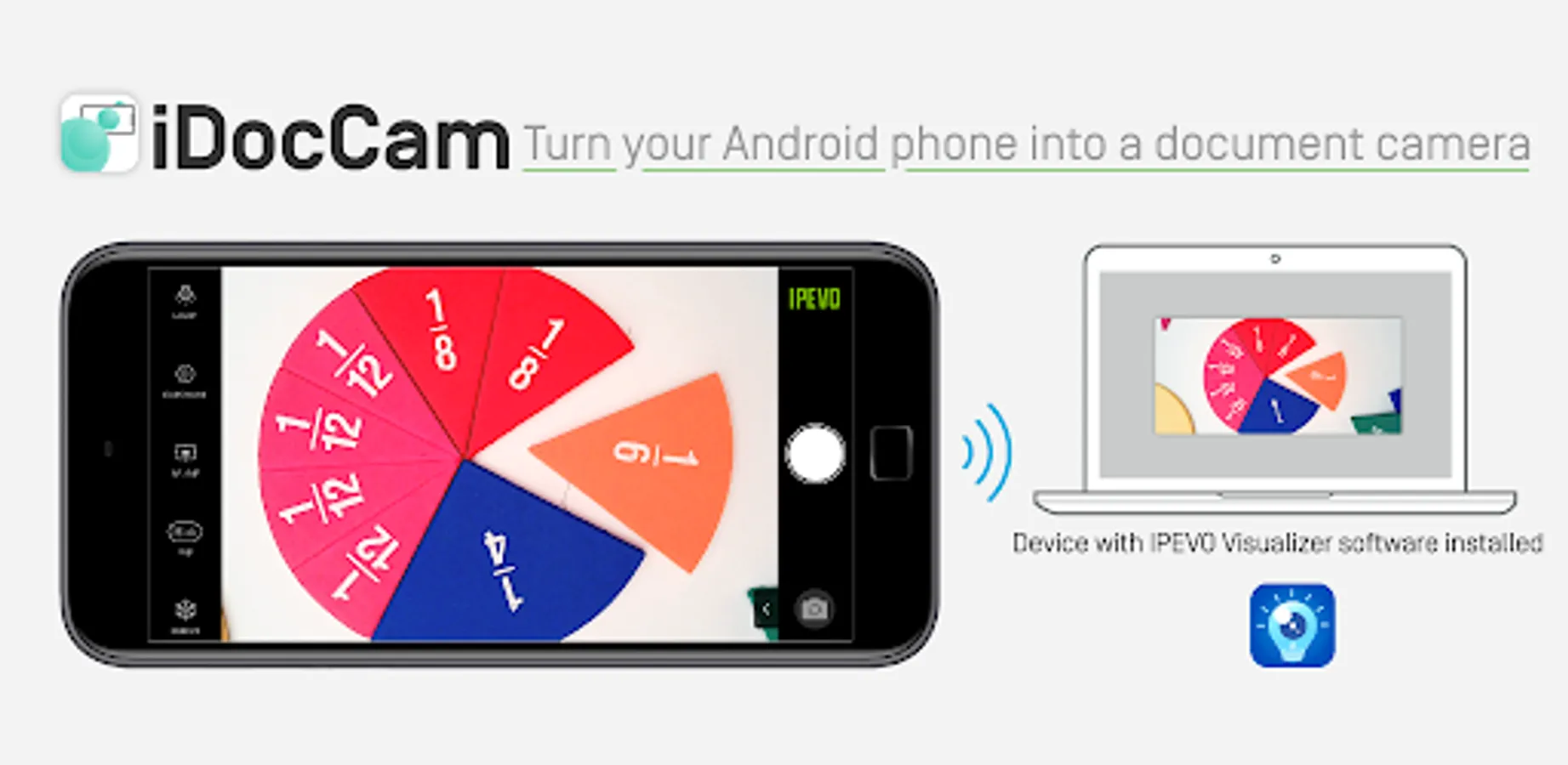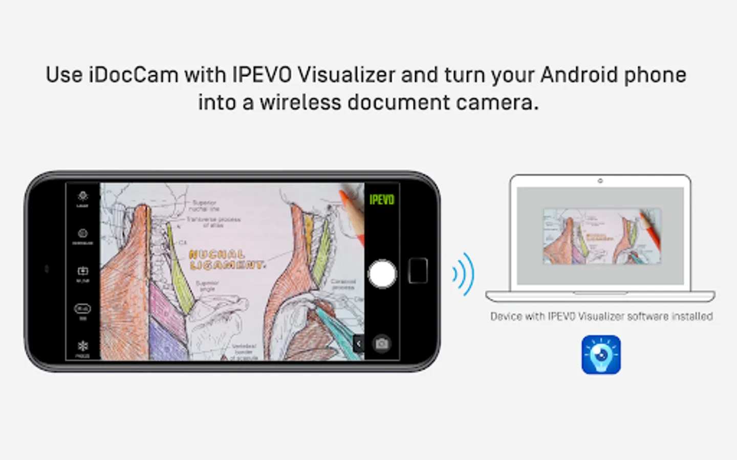 Install iDocCam on your phone. Next, install IPEVO Visualizer software on another device (Mac/PC/Chromebook/iOS & Android devices).