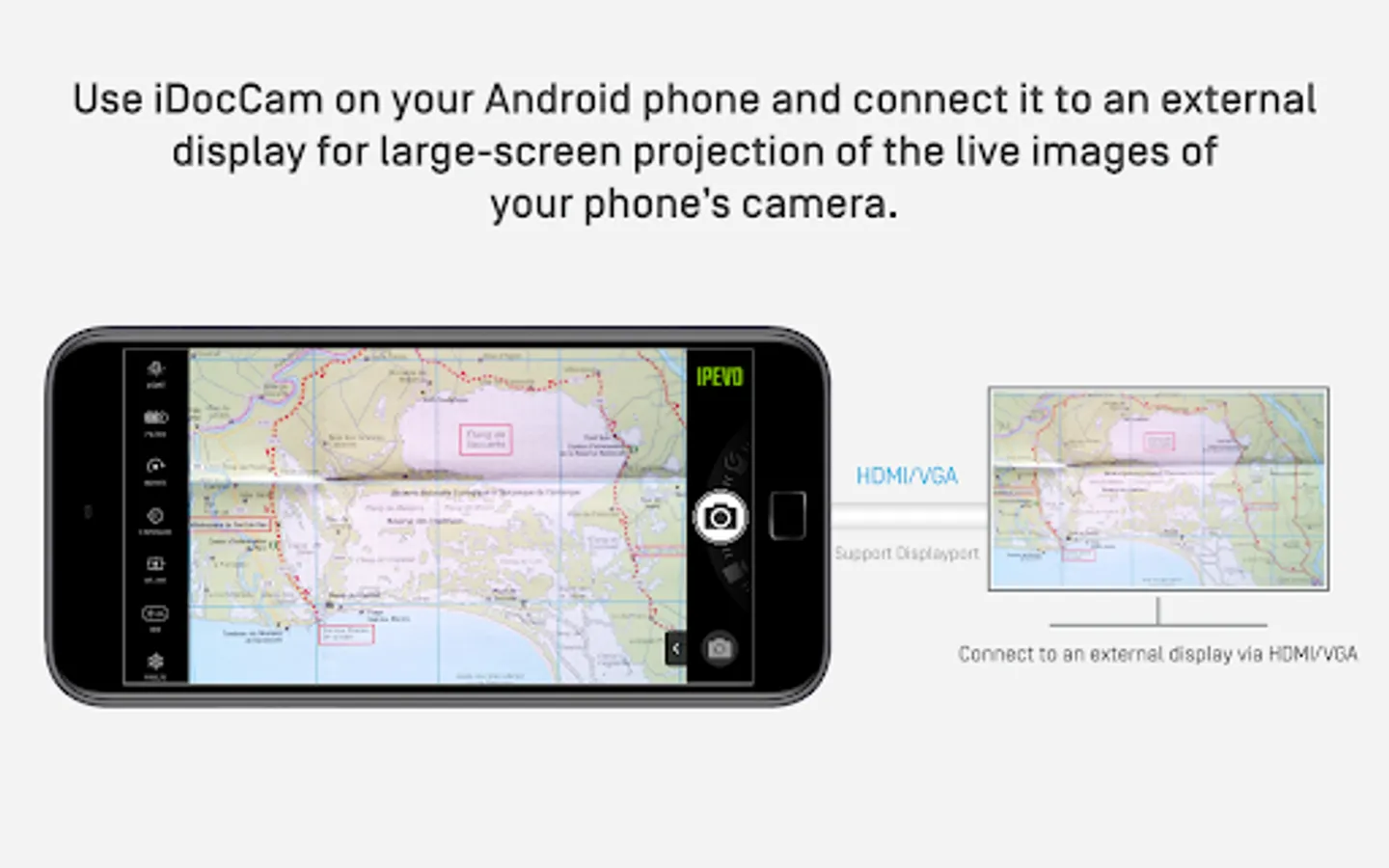 Before you start, please make sure your phone supports DisplayPort Alt Mode. Launch iDocCam on your Android phone.Then, connect your phone to an external display via HDMI/VGA (using a type-c to HDMI/VGA adapter). Alternatively, you can use Miracast, or Chromecast to connect your Android device to an external display wirelessly. Once connected, you can use the external display as an extended screen to project the live images of your phone’s camera.