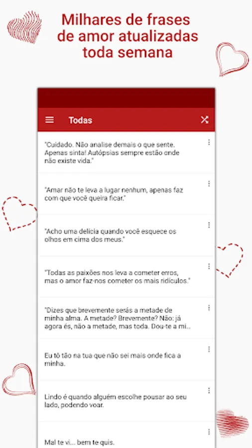 Phrases of Love is an app to share phrases of passion and feeling in the form of text or image. Share on Instagram, WhatsApp, Facebook and other social networks. There are thousands of phrases updated weekly classified in dozens of categories.