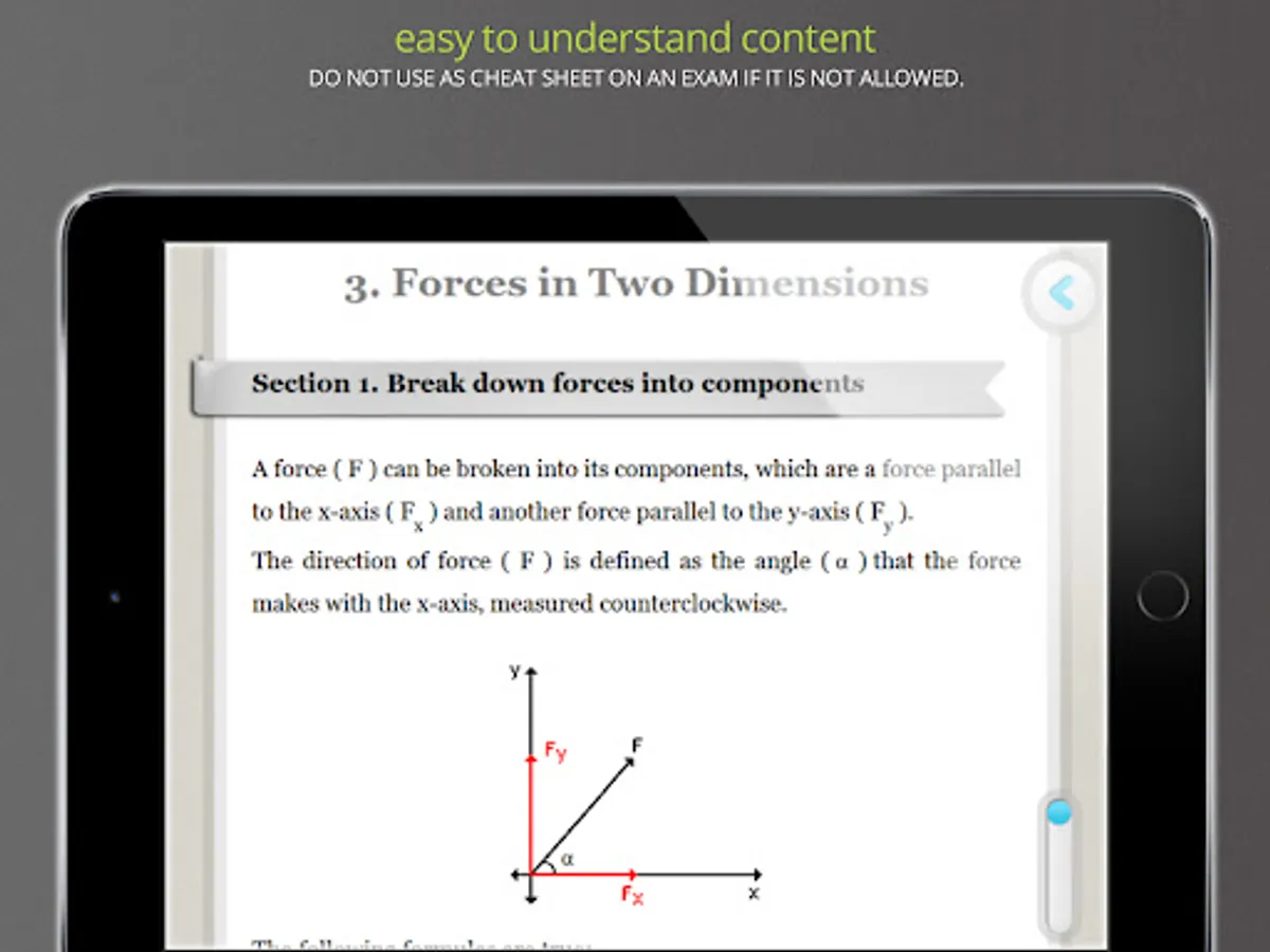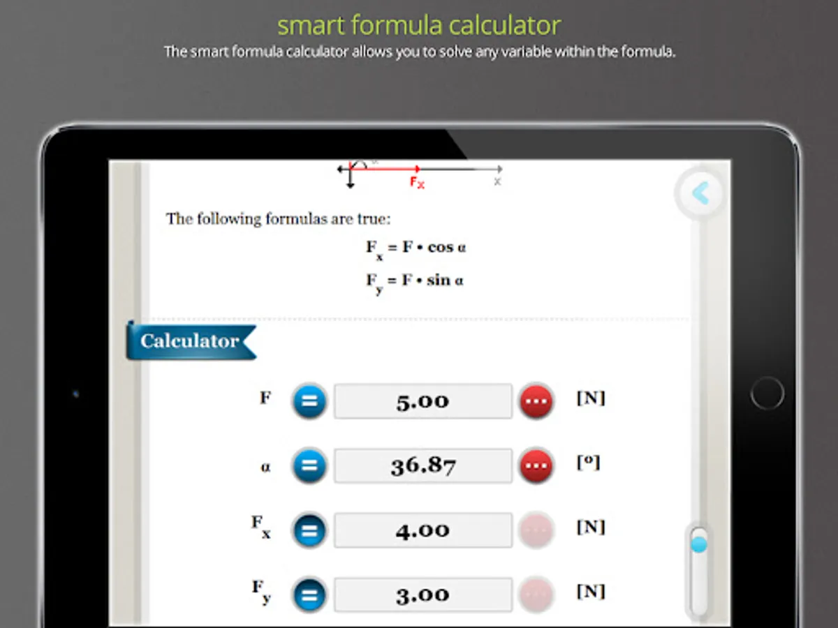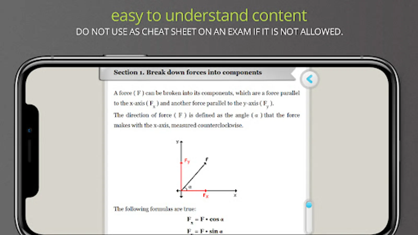 The app features a comprehensive list of formulas for the physics topics listed bellow, each with a smart formula calculator that allows you to solve any variable within the formula.