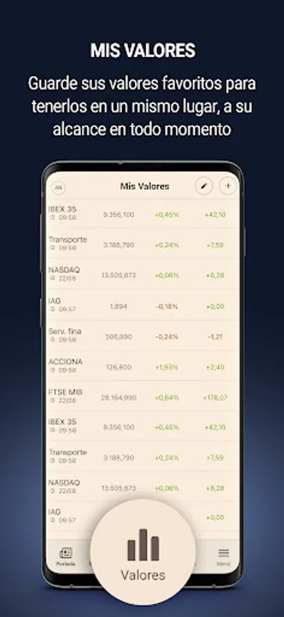 · My Values: Find and save the values and indexes you want to track. Thanks to this function you will be able to keep track of all your investments.