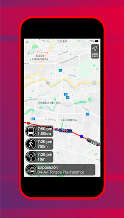 - You will see the information of times and distances in the lower left part of the screen, from the bus to the selected stop, your location to the selected stop and the stop to the Metrorrey station, as well as knowing the name of the stop and station.