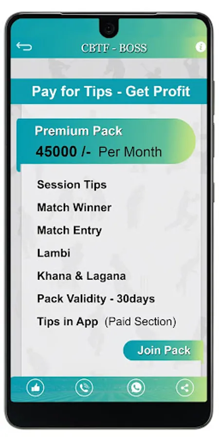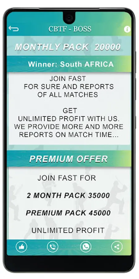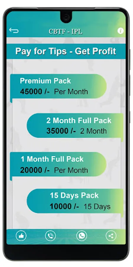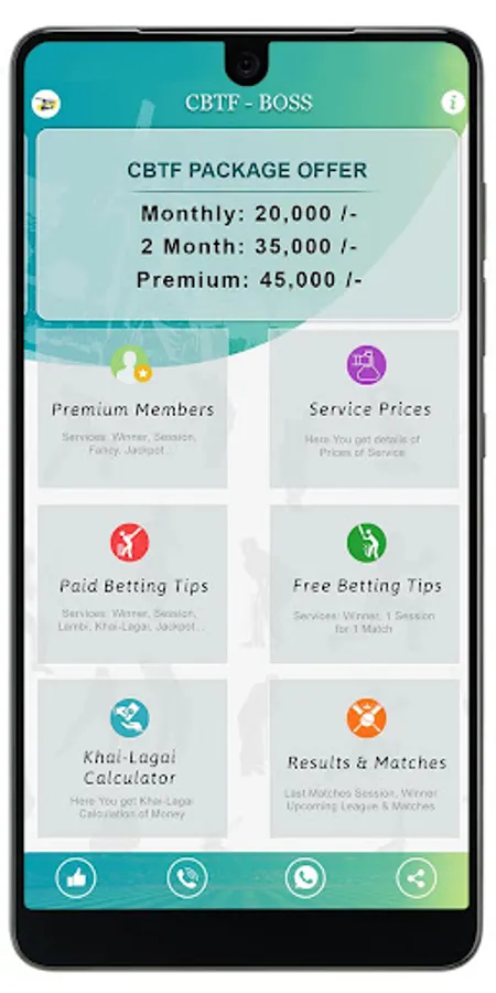 In this app you will get a free prediction and also paid. For All This There Are Many Features Likes Premium Members, Free Cricket Betting tips, Etc. In This Premium Service You Have to Add For Paid Service And In Free You Just Get All Predictions For Free Without Any cost ( DEMO TIPS ).