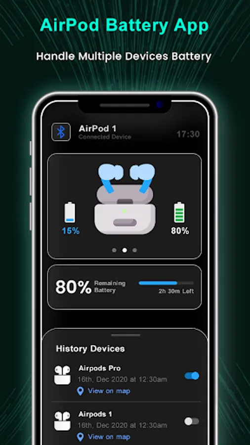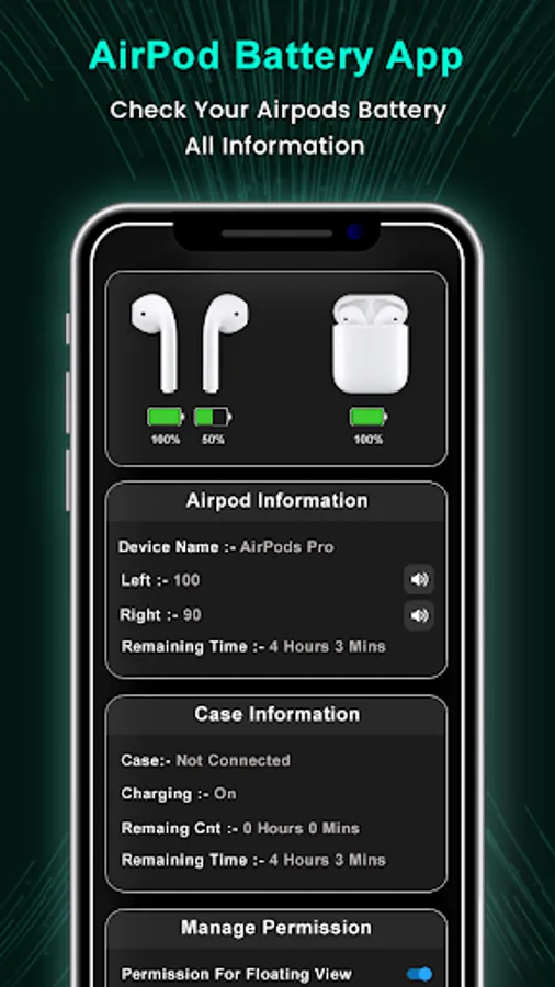 Airpods Battery Status Level app provides Android phones battery levels (e.g. 80%, 90% 100% etc.) and also tells the estimated remaining battery time of your airpods or Bluetooth devices.