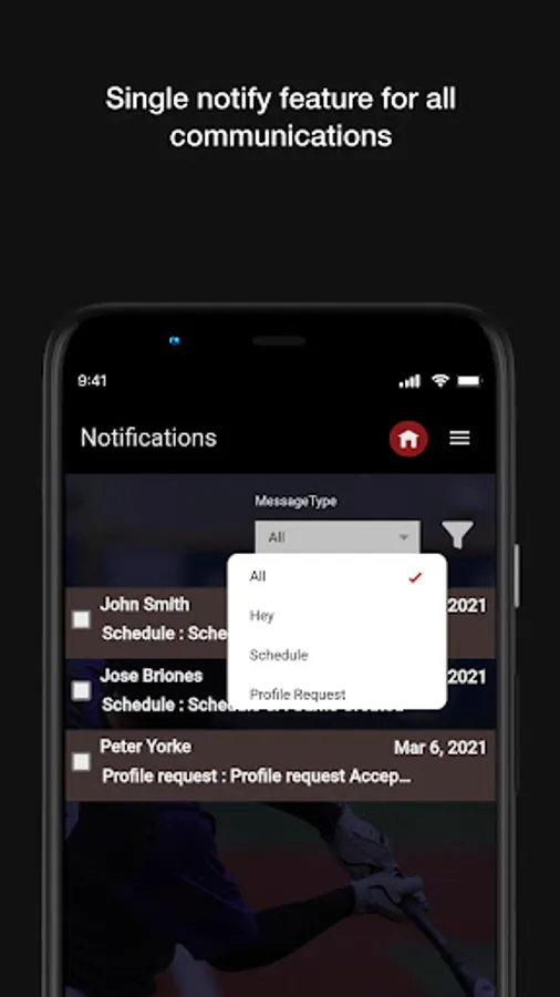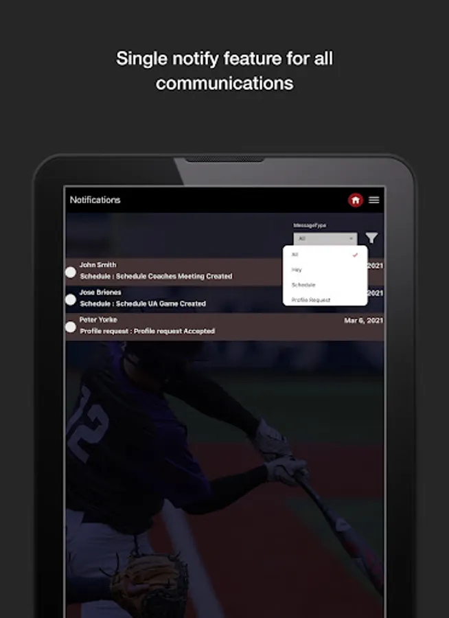 Hey Feature provides an in-app notification and email messaging interface for the coach to communicate to the entire team or selected players.