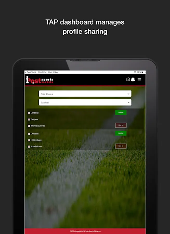 The primary feature of TAP is to access each player's iPost Sports Profile to track player progress, communicate to families, schedule events, and easily update player performance during games and during indoor training activities. As part of the iPost Sports Platform, TAP includes a full solution that integrates into unique technologies that can be used in-season and during the off-season.