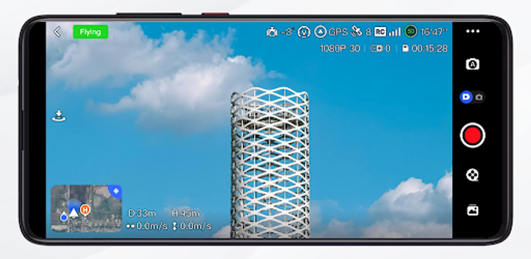 The App shows real-time video transmission, displays flight parameters and allows you to customize, shoots HD images and records videos, etc.